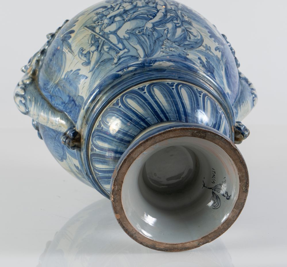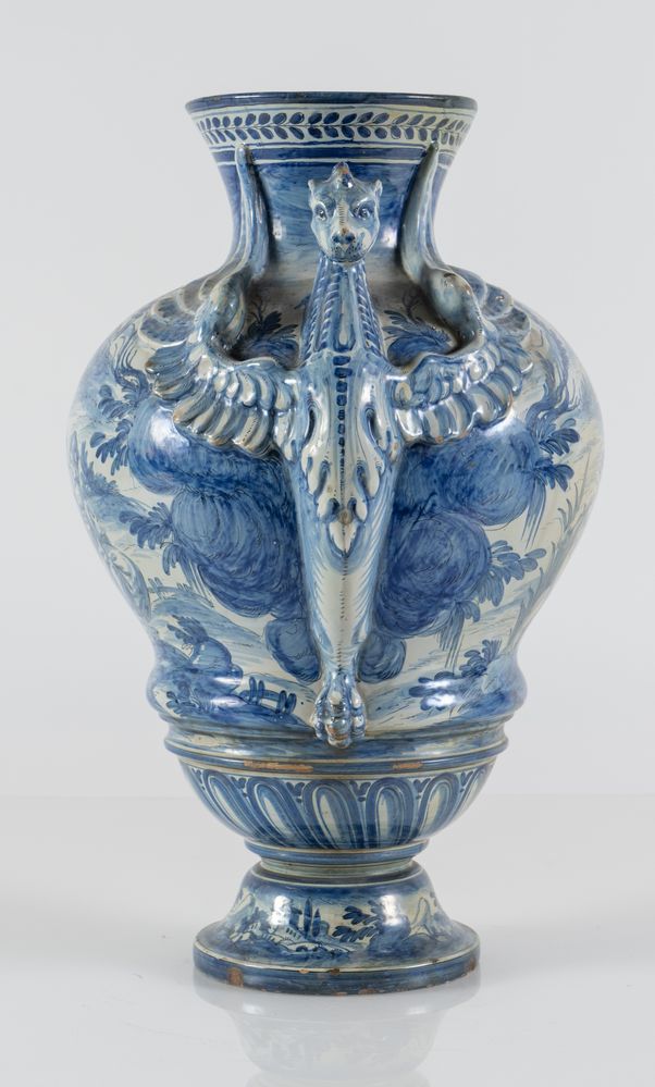 Manifattura Cantagalli, fine del XIX secolo - inizio del XX secolo . Vaso decorato sui toni del blu, con maniglie a guisa di drago. Cm 52,5x Ø 40. (difetti e restauri)