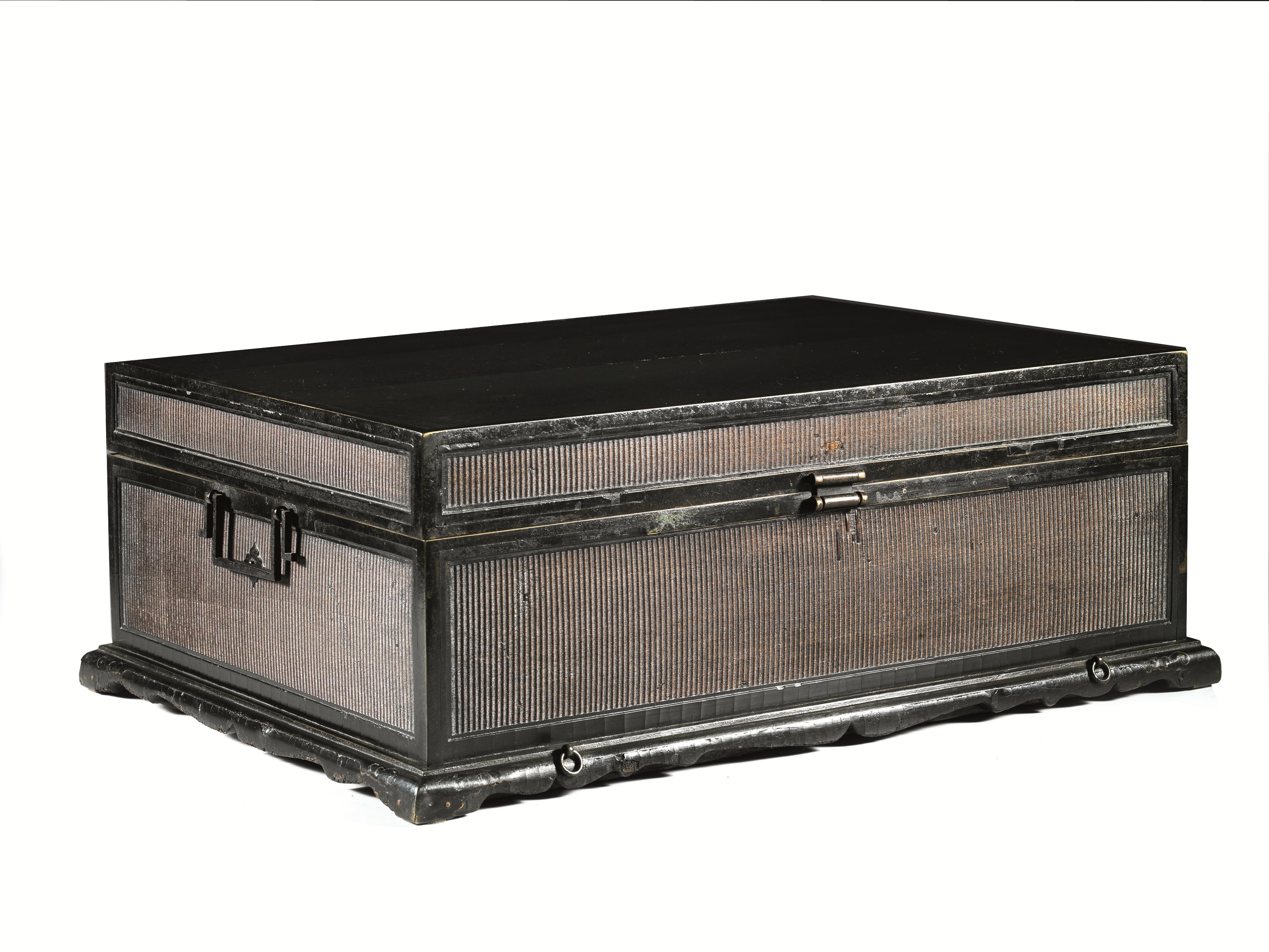 Grande scatola da viaggio, Cina, dinastia Ming-Qing, sec. XVII, in legno e bamboo, di forma rettangolare, profilata in metallo, su base sagomata, cm 62,4x22,5x46,2