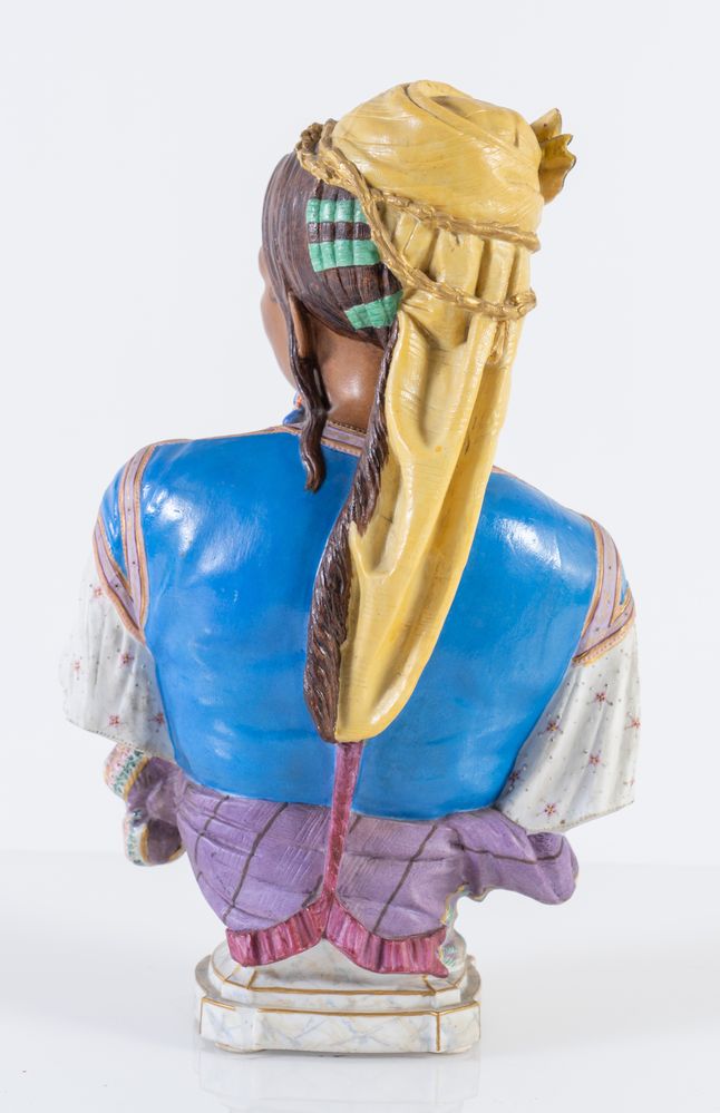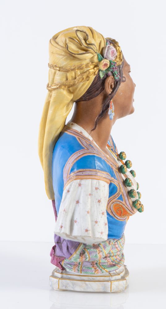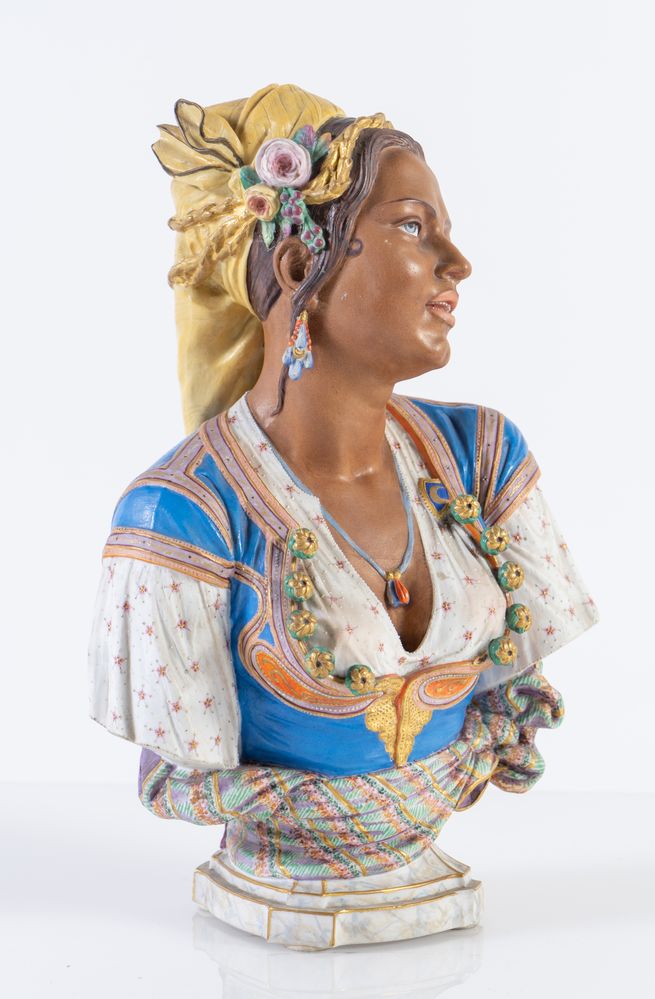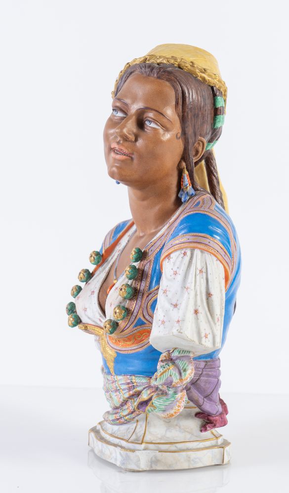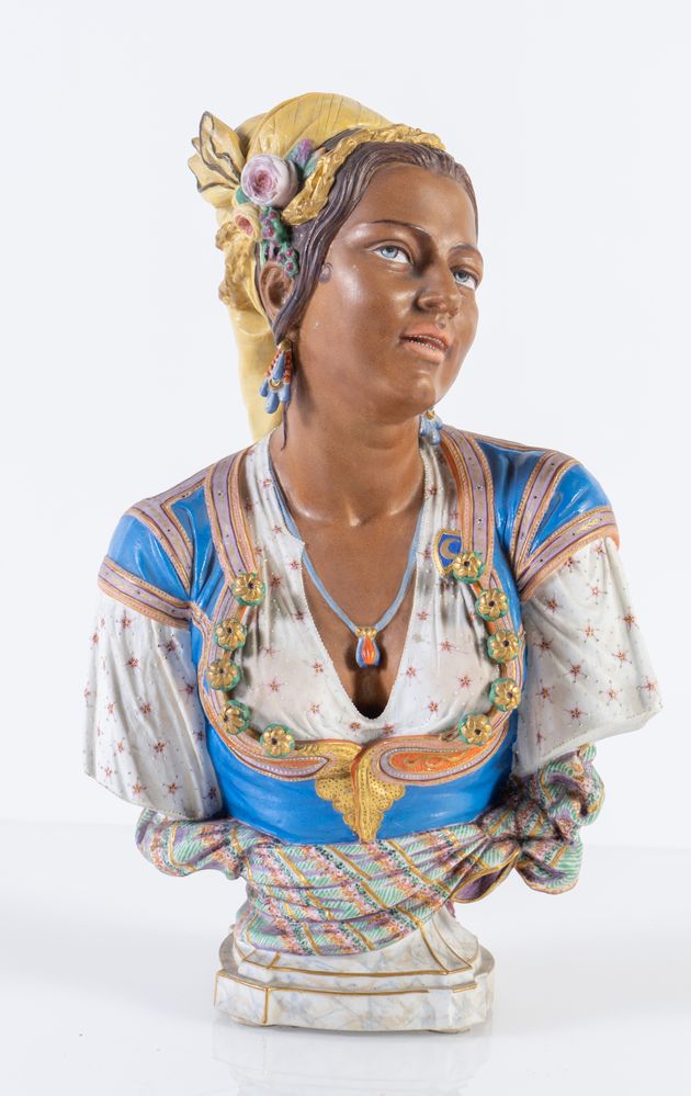 CHARLES HENRI JOSEPH CORDIER (Francia 1827 – 1905), attr. "Mauresque d'Alger Chantant". Seconda metà del XIX secolo. Busto in porcellana smaltata. Reca firma C. Cordier. Cm 38,5x23,5x15,5.