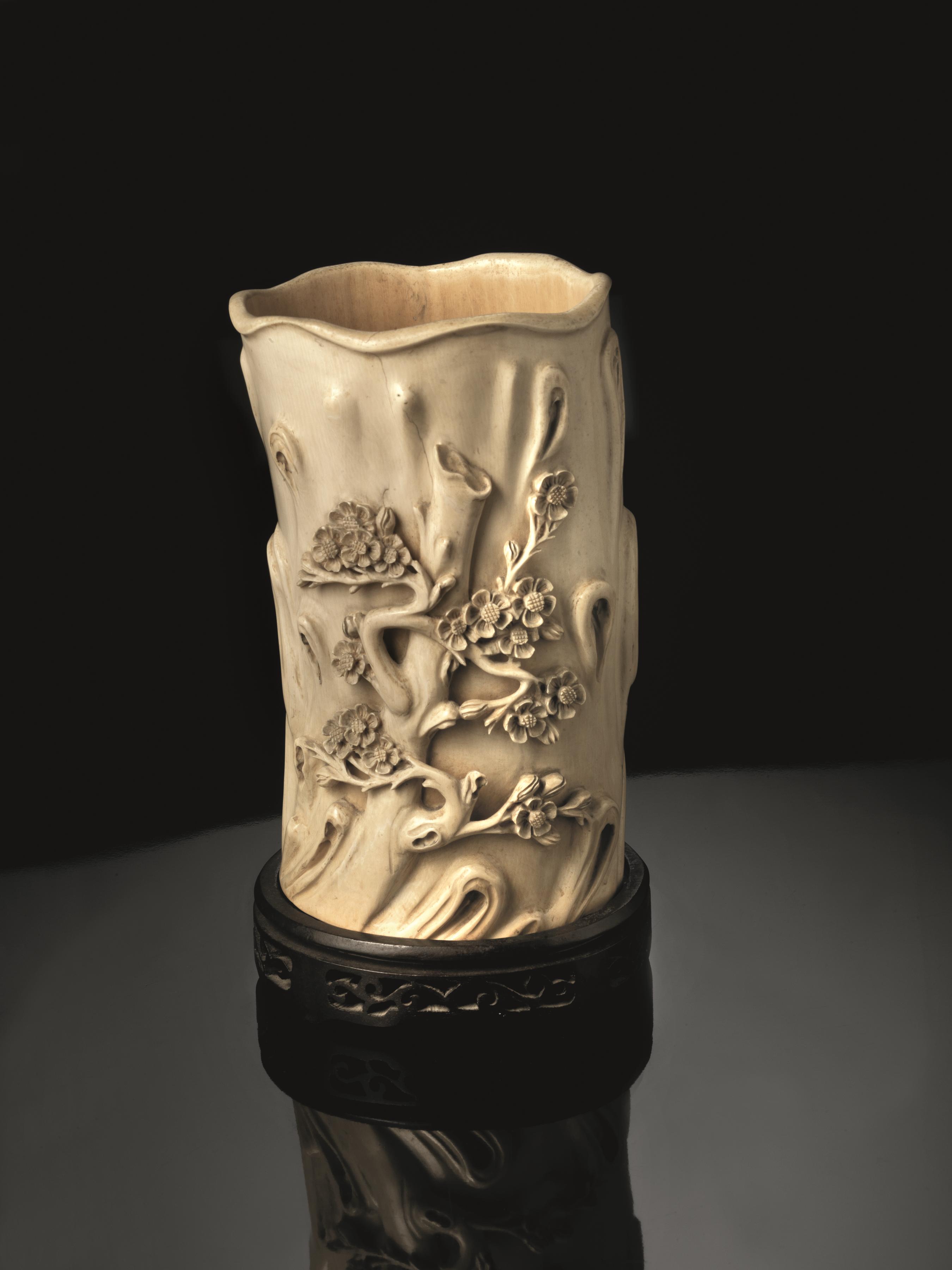 Vaso porta pennelli Bitong, Cina dinastia Qing, sec. XIX, in avorio scolpito, lavorato in rilievo a motivo di arbusti fioriti, alt. cm 24
