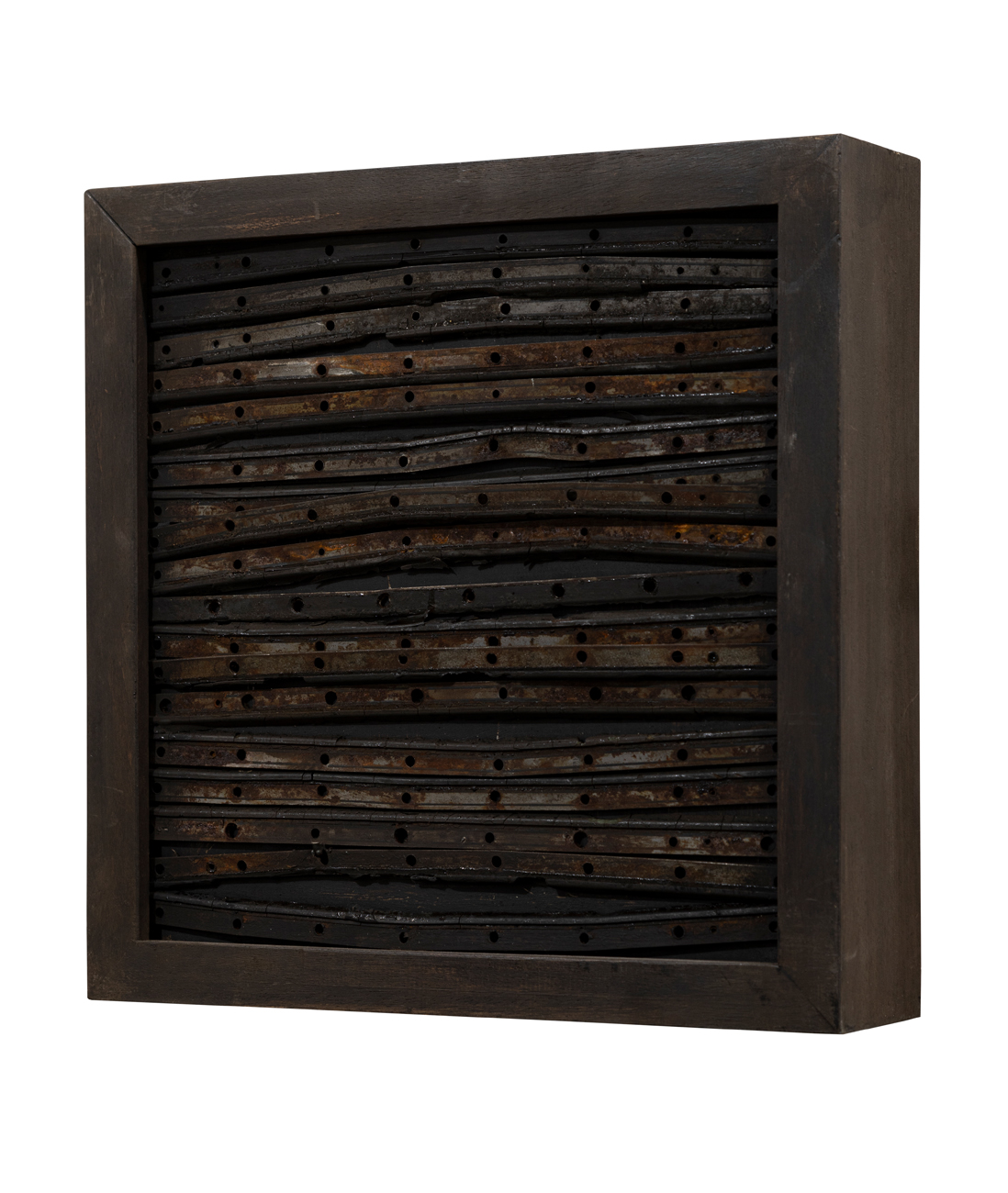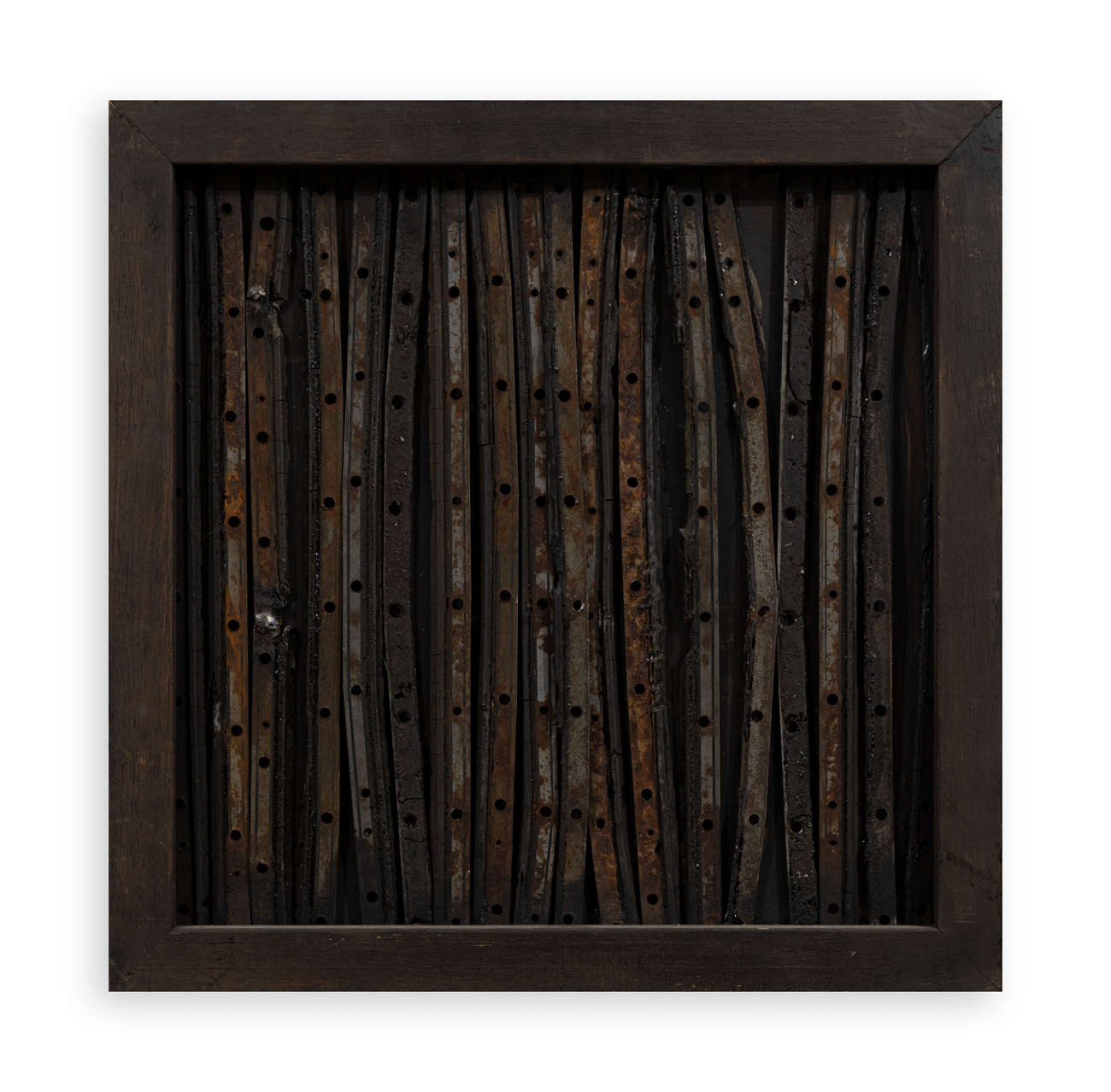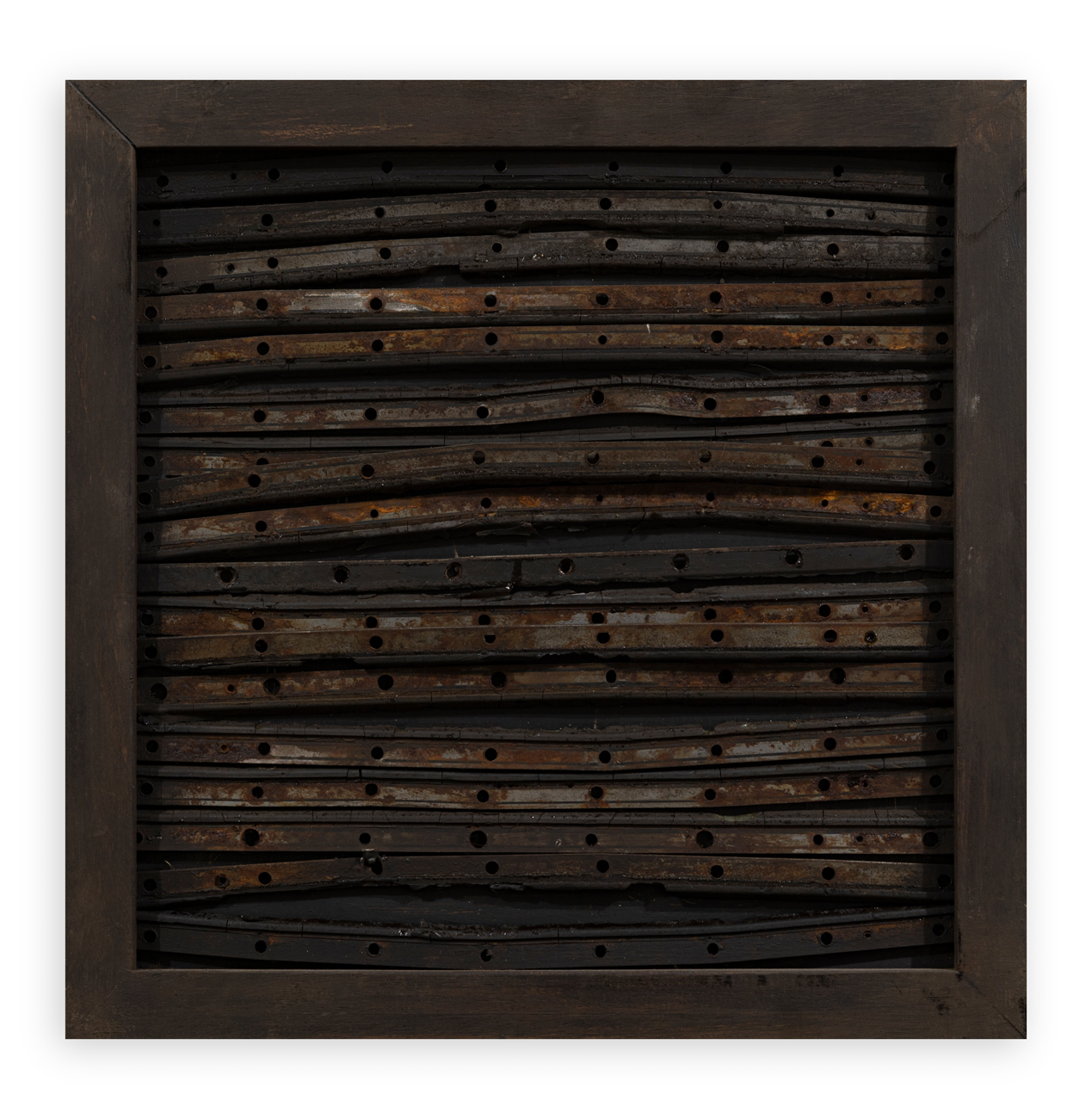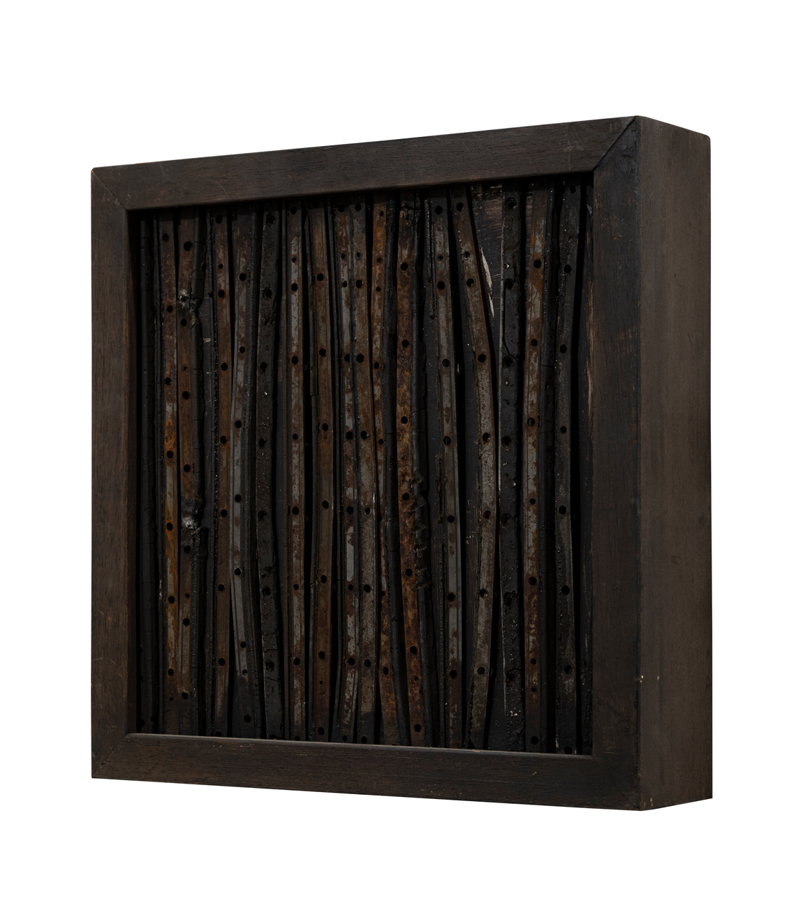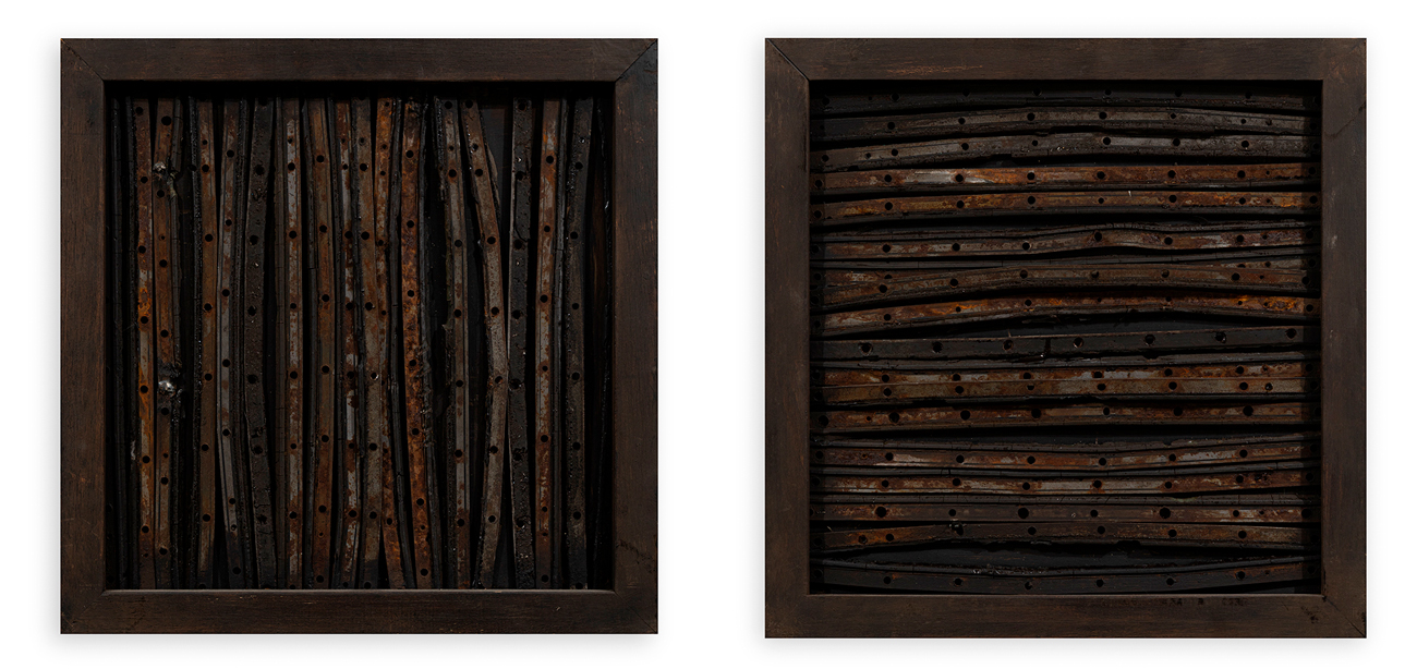 Dittico di sculture con elementi in gomma e ferro entro cornice di legno intagliato