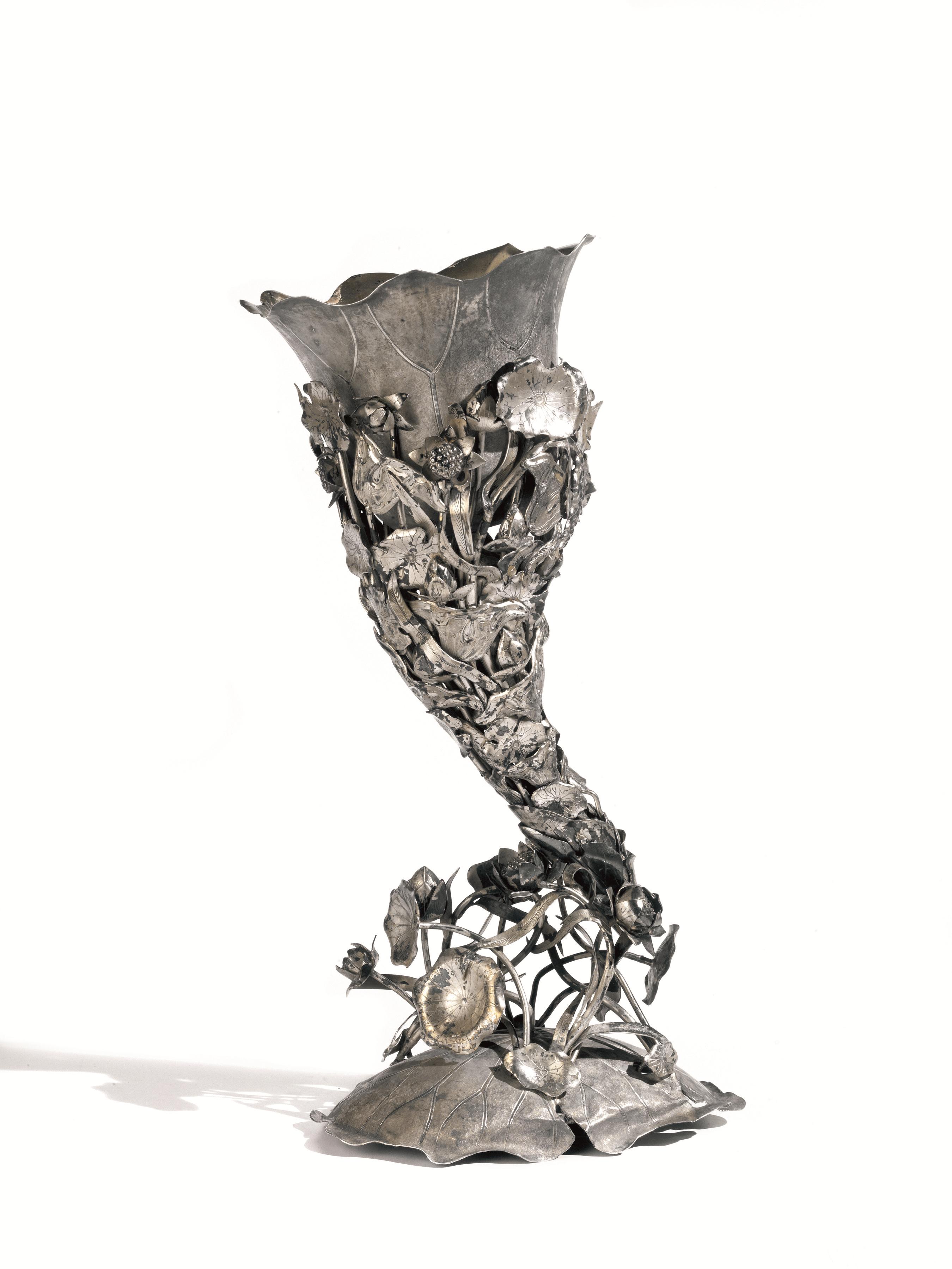 Coppa da libagione, Cina, periodo repubblicano, in argento lavorata a motivi fogliacei e floreali, alt. cm 32, gr. 725