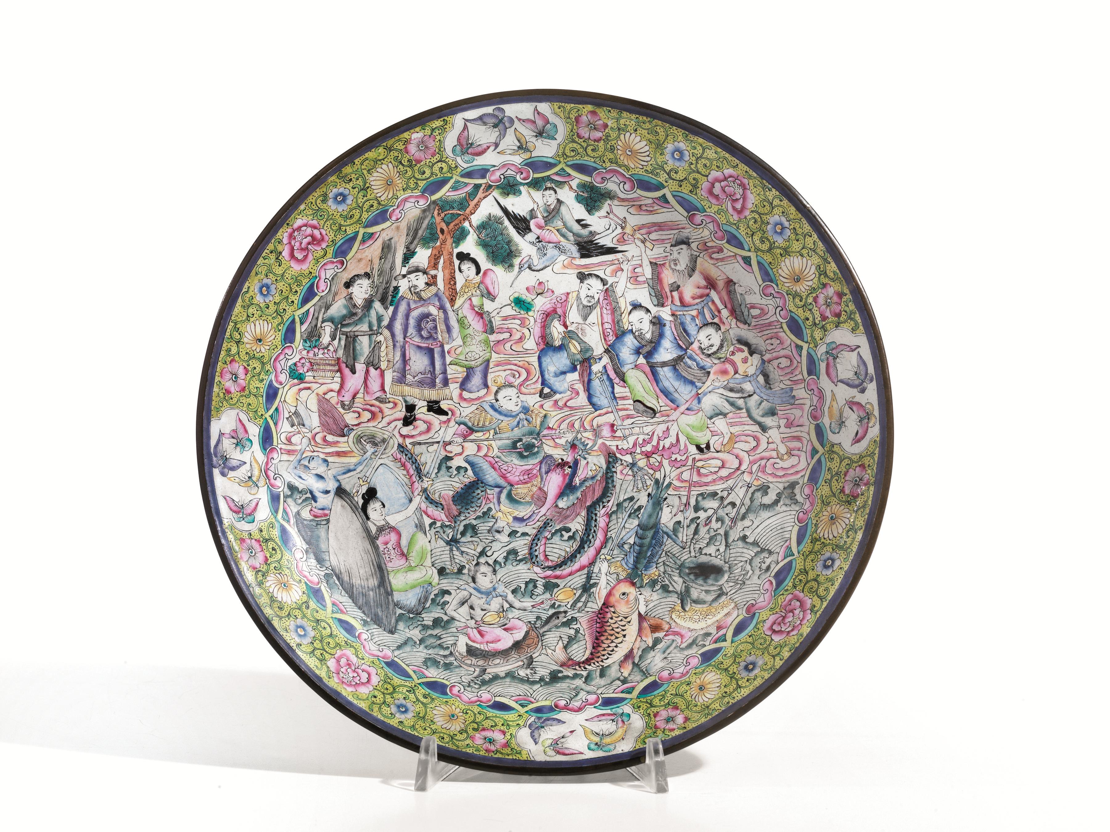 Piatto, Cina sec. XIX, in smalto di Canton, finemente decorato con figure,...