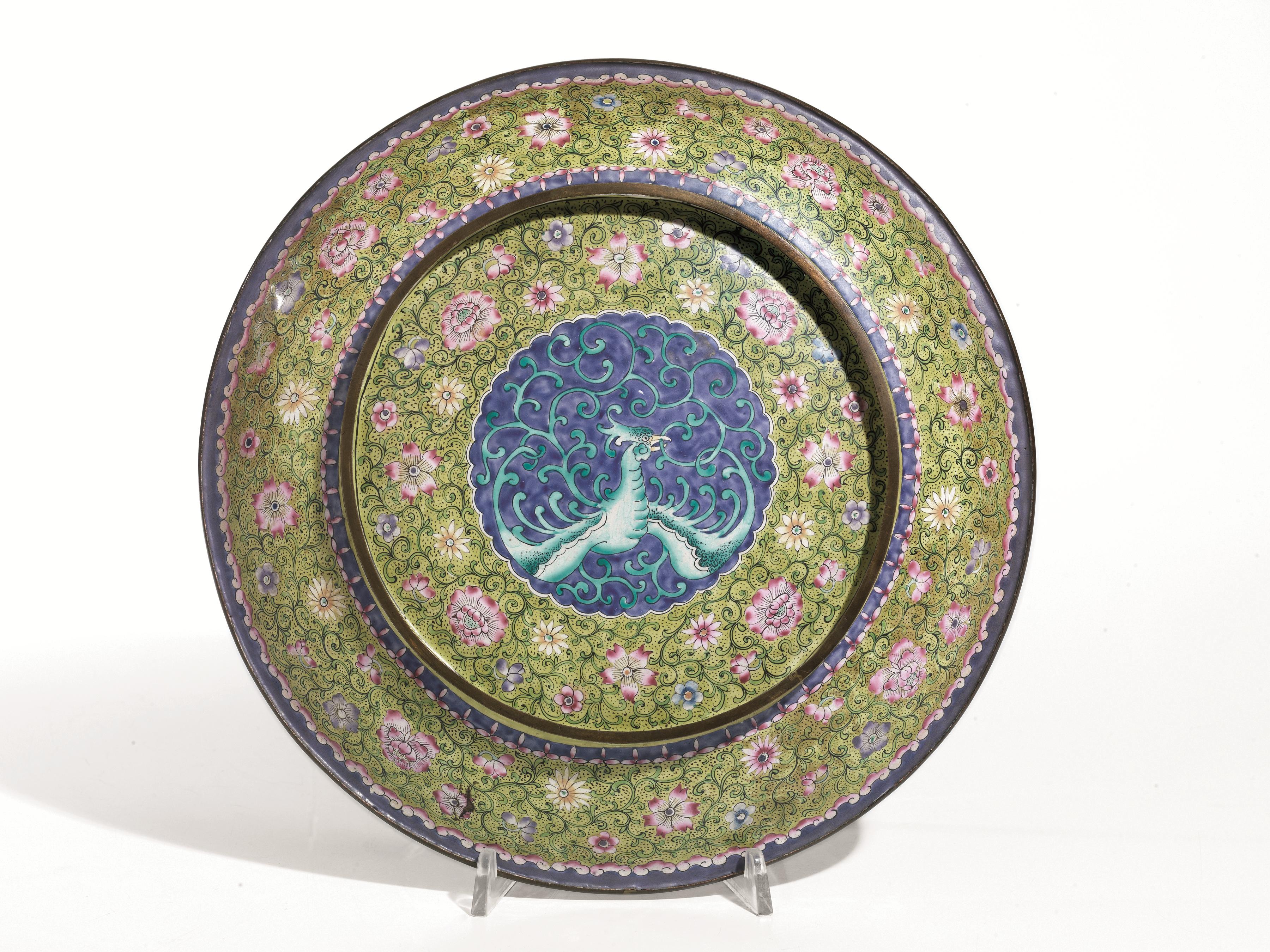 Piatto, Cina sec. XIX, in smalto di Canton, finemente decorato con figure, fiori e farfalle, diam. cm 26,5