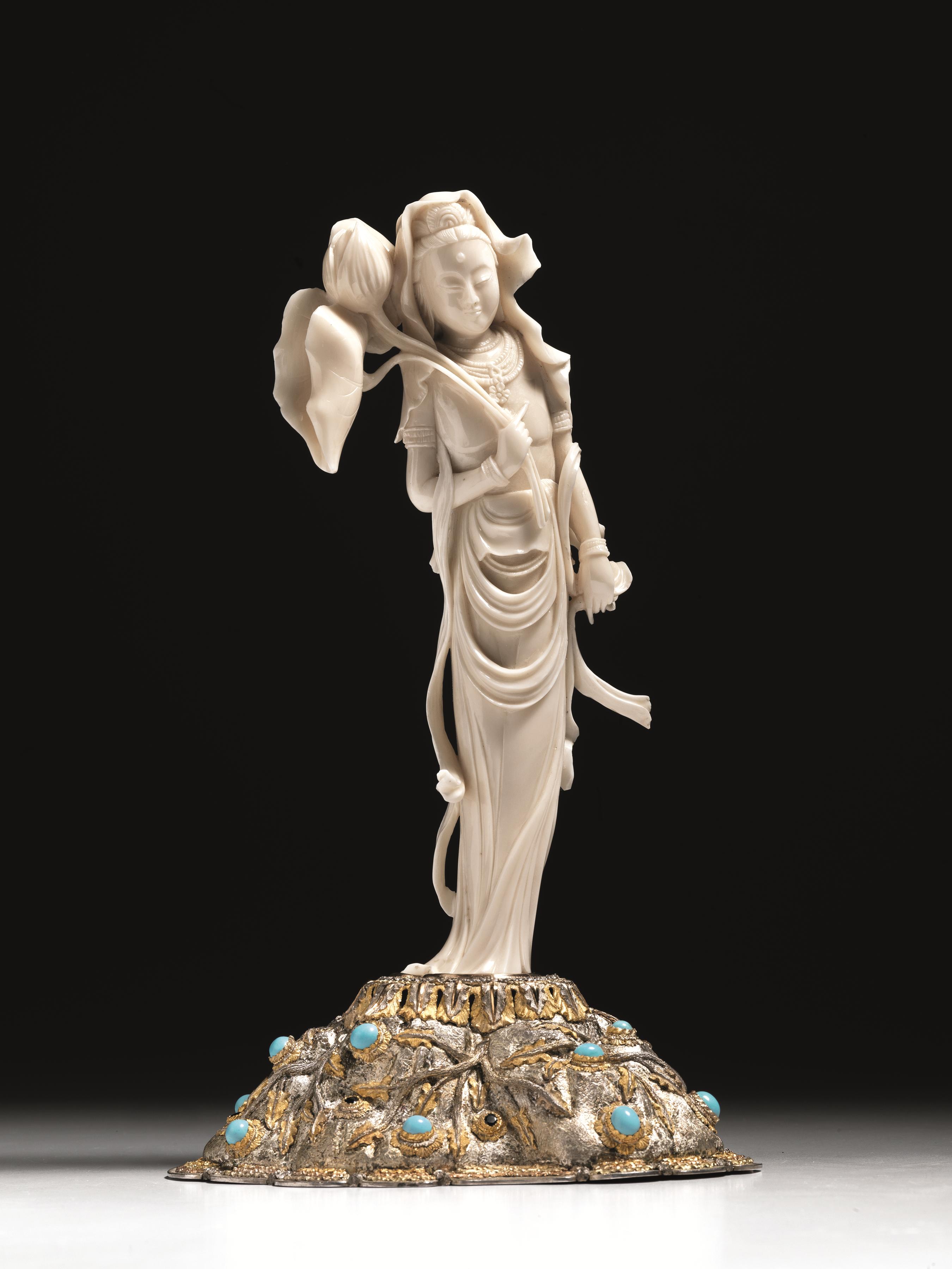 A Chinese carved white coral Guanyin on a silver base with gold inserts and precious stones, early 20th c.
