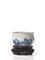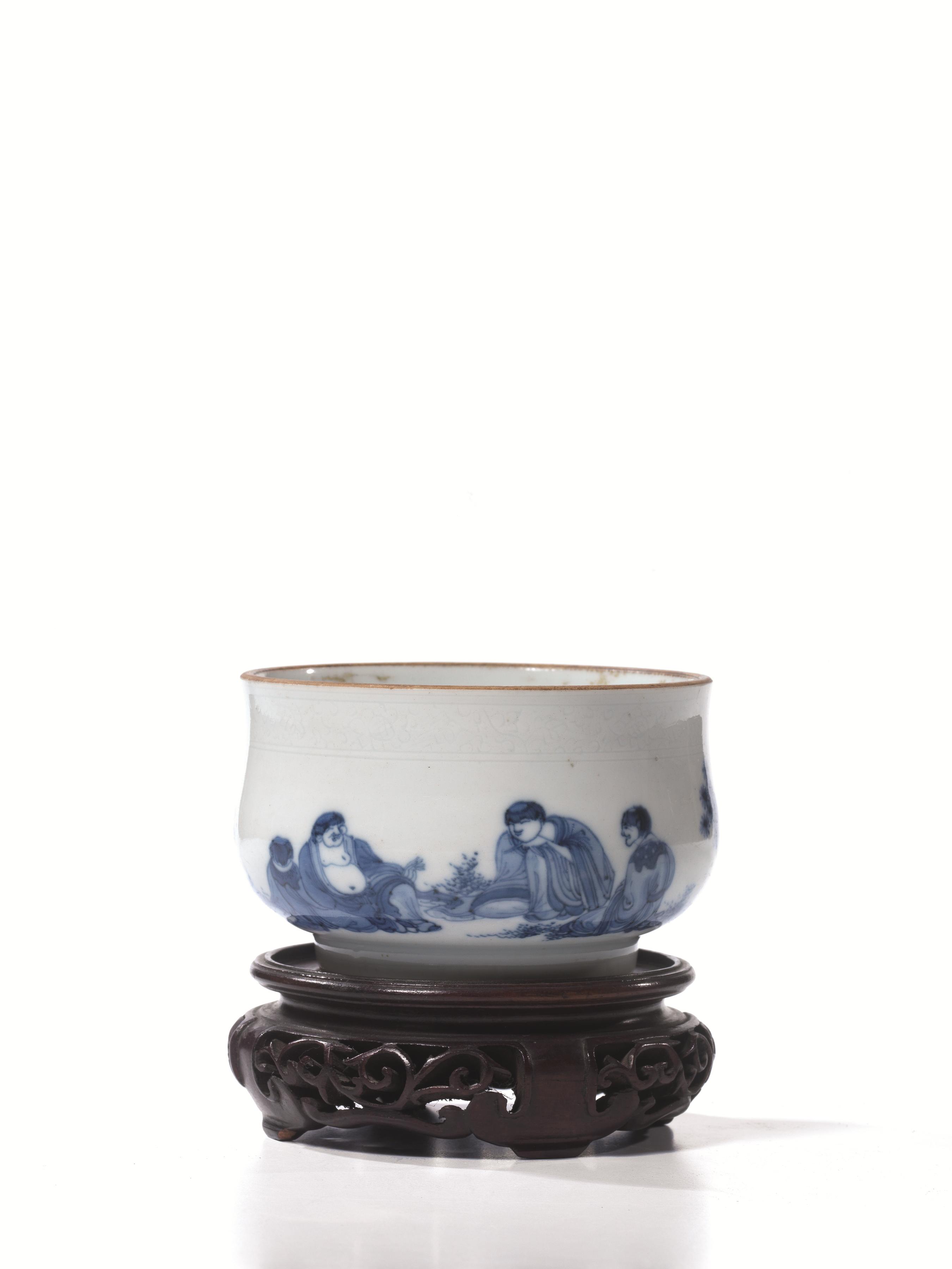 Ciotola Cina sec. XVII-XVIII, in porcellana bianca e blu, il bordo finemente inciso a motivi floreali, il corpo decorato con figure in un paesaggio, diam. cm 10,5, alt. cm 6,7, poggiante su base in legno