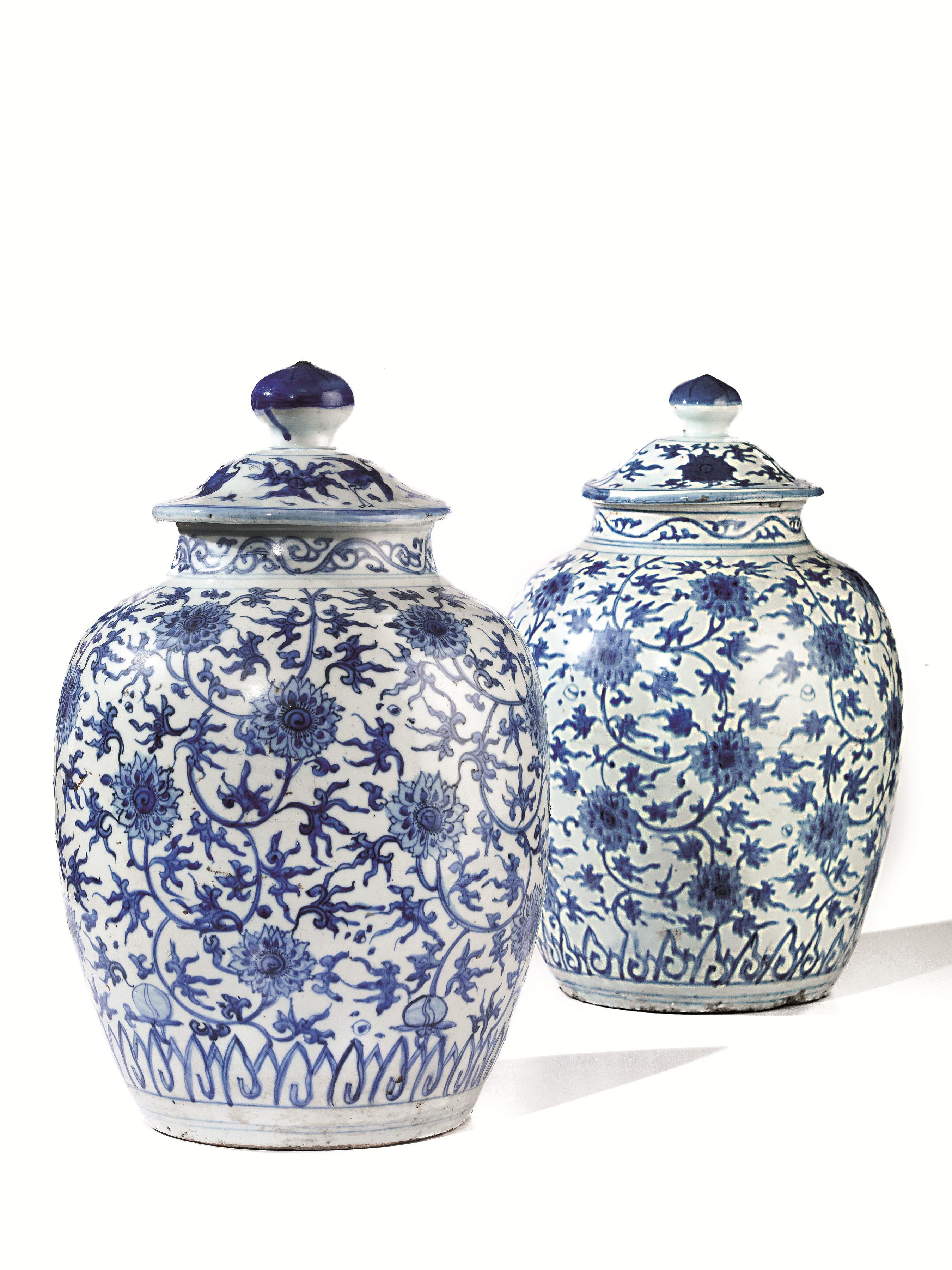 Coppia di potiches, Cina dinastia Ming, (1368-1644), in porcellana bianca e blu, decorate a ramages floreali, un coperchio forse non pertinente, alt. cm 50 (2)