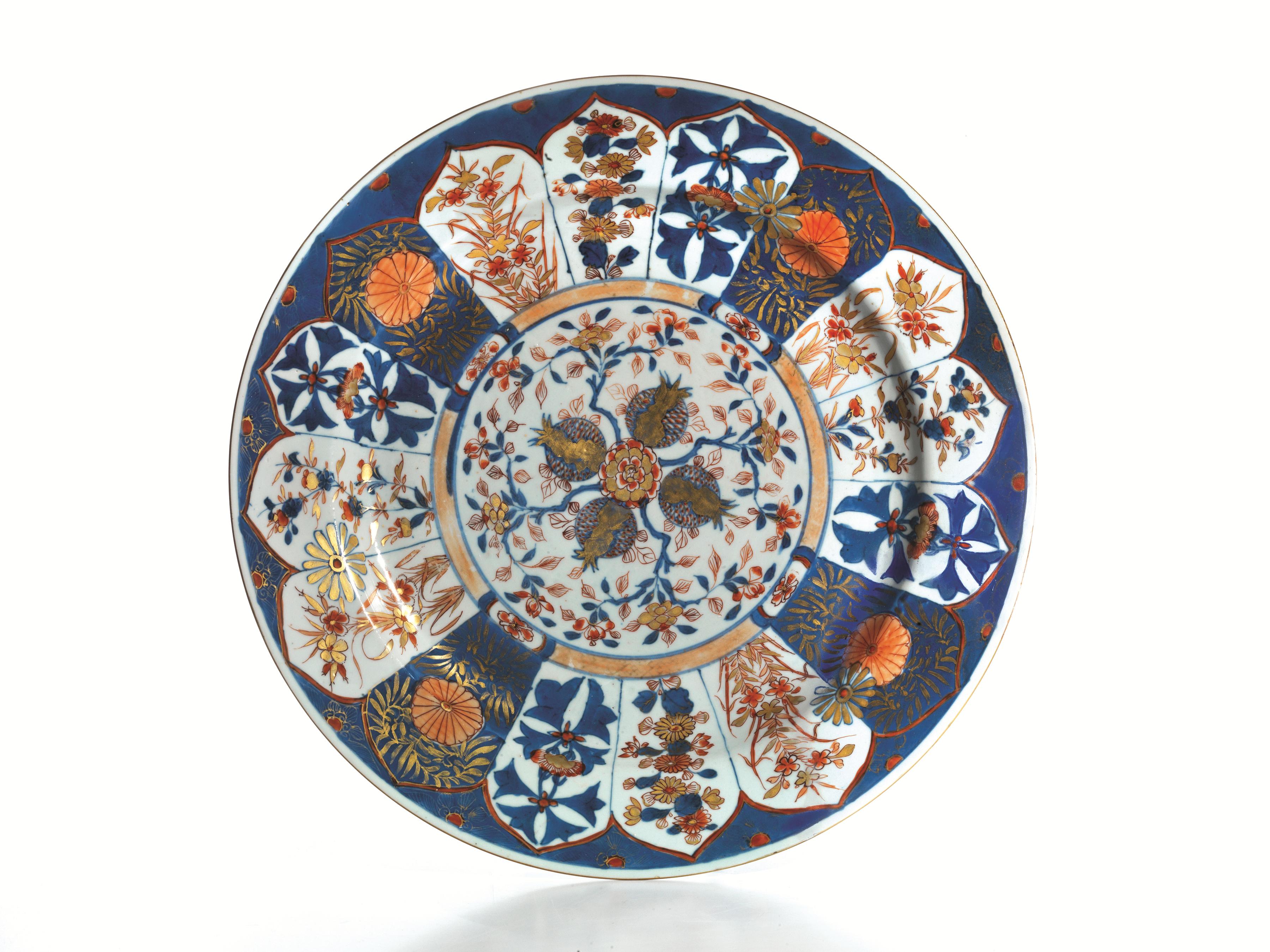 Grande piatto, Cina, periodo Kangxi (1661-1722), in porcellana Imari, decorato al centro da melograni e sulla tesa da sedici riserve a motivi floreali, marchio della losanga, diam cm 39