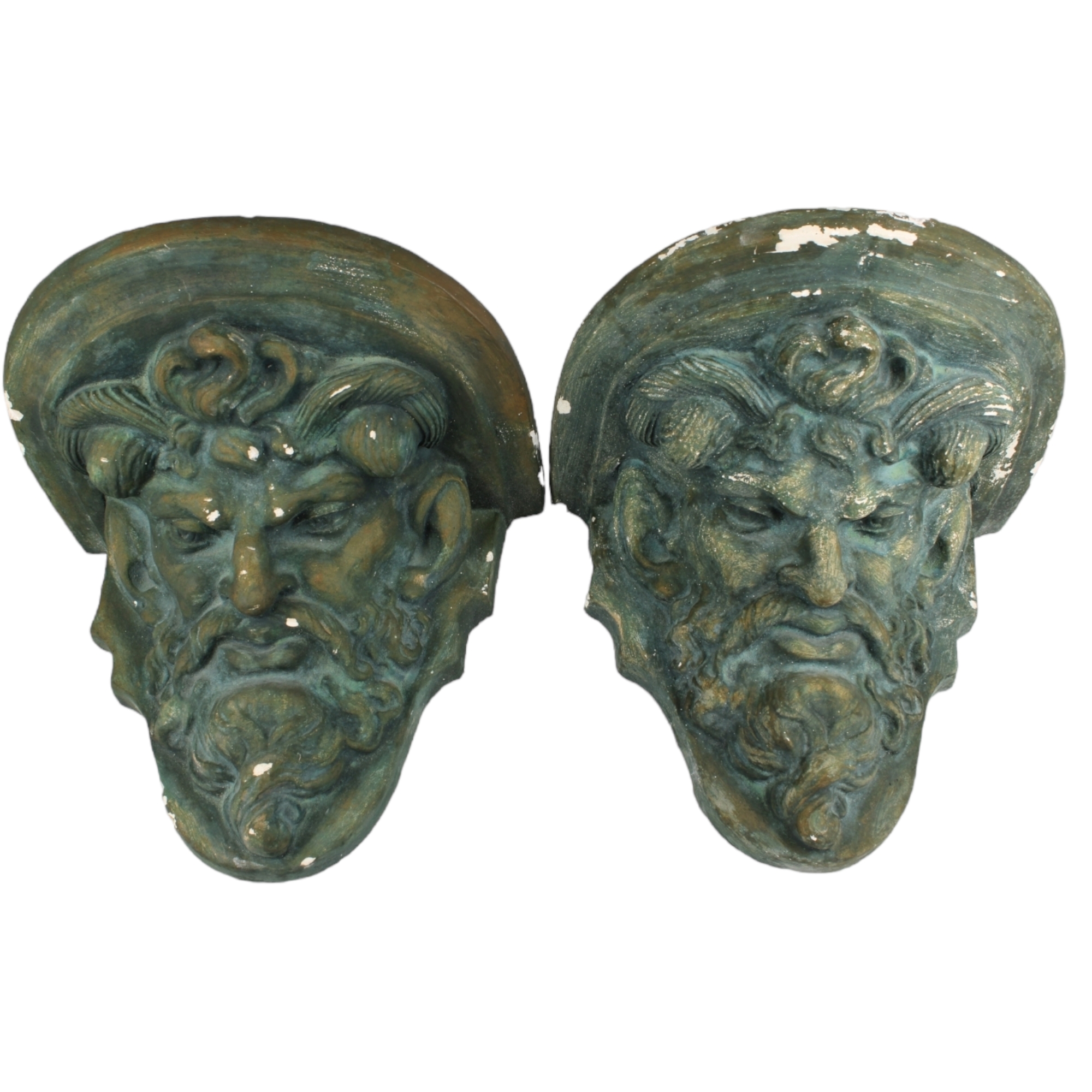 COPPIA MENSOLE in terracotta patinata a forma di mascherone XX secolo Sicilia h cm 30 x 31 x 25