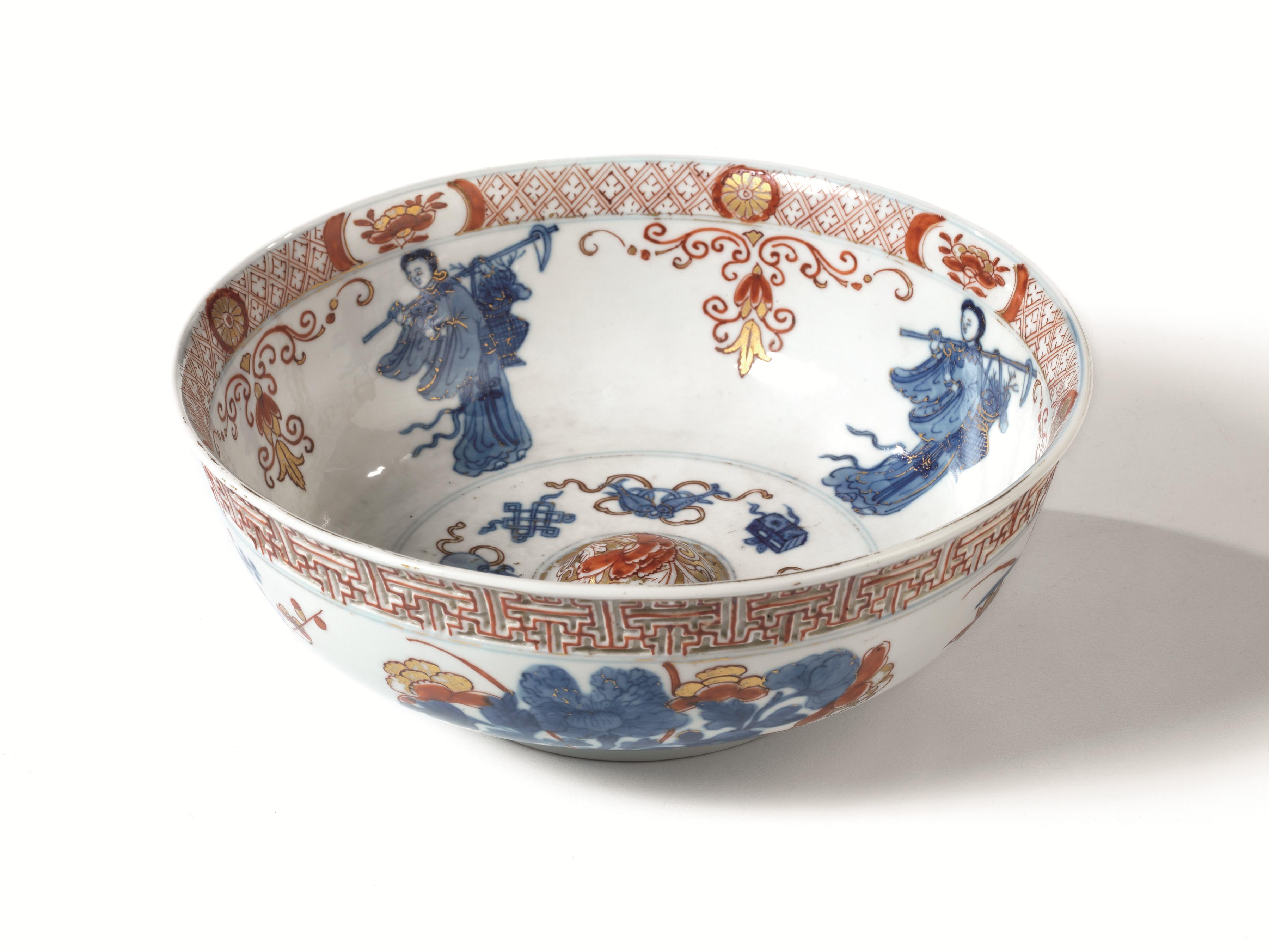 Ciotola Cina dinastia Qing, periodo Kangxi (1661-1722), in porcellana policroma decorata a motivi floreali all'esterno e con figure e simboli di buon auspicio all'interno, diam. cm 19