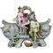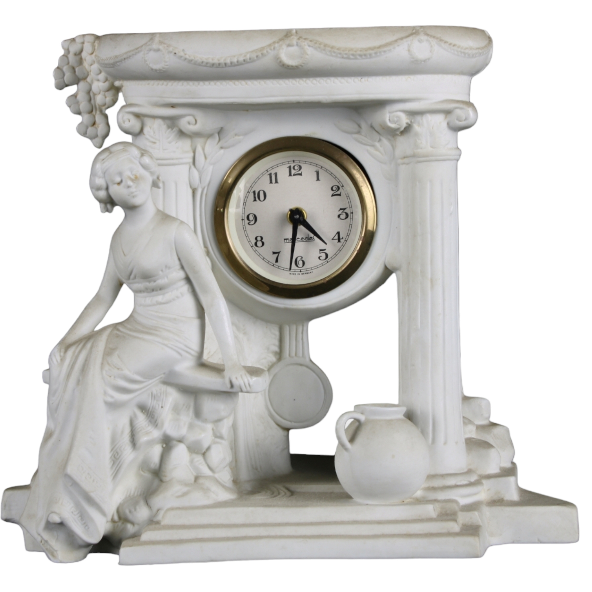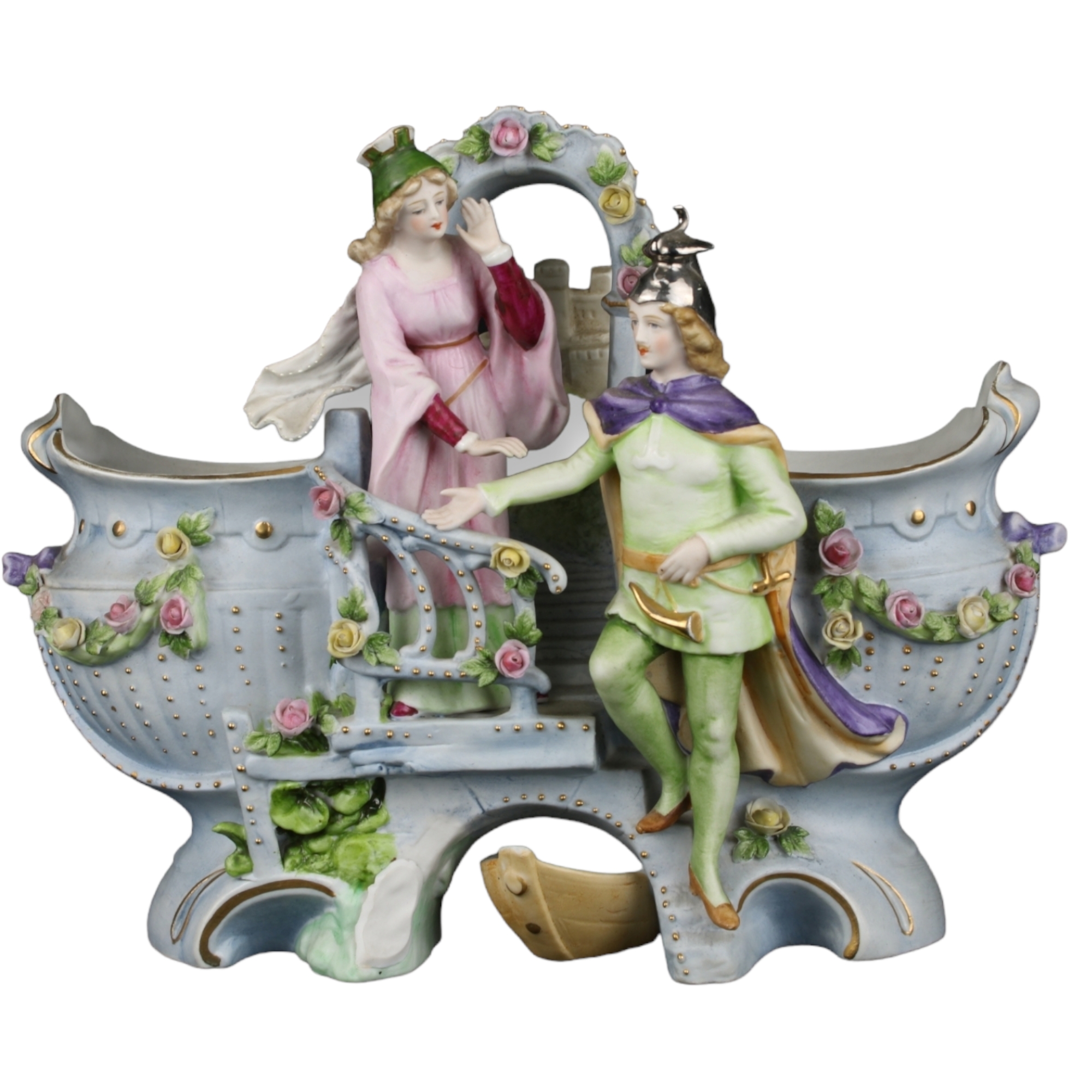 LOTTO DI 2 OGGETTI IN BISCUIT DI CUI: Orologio da tavolo con giovane donna al ruscello e Fioriera policroma con scena galante Primi '900 Sicilia h cm 21 x 25 x 10- h cm 20 x 22 x 11