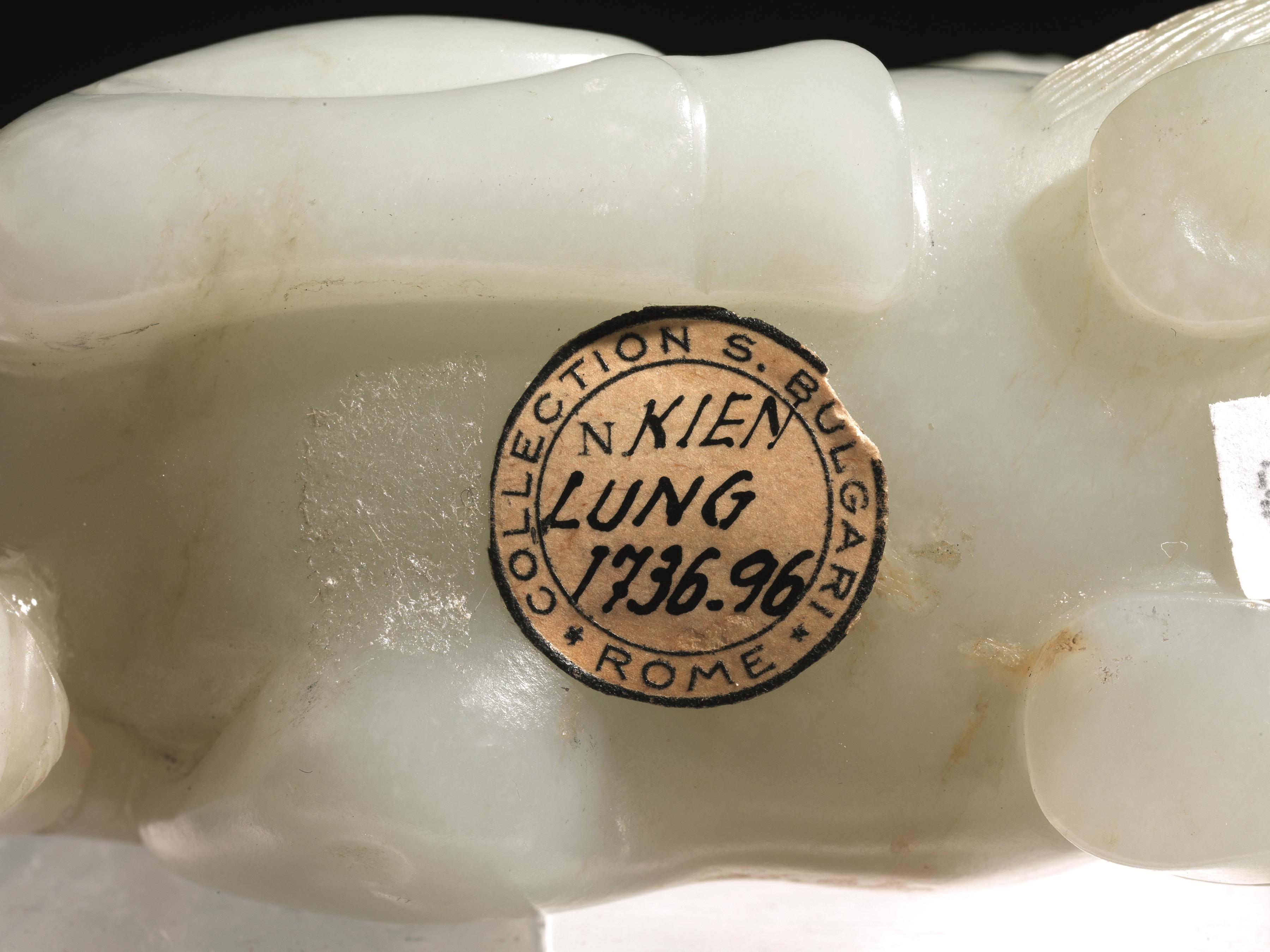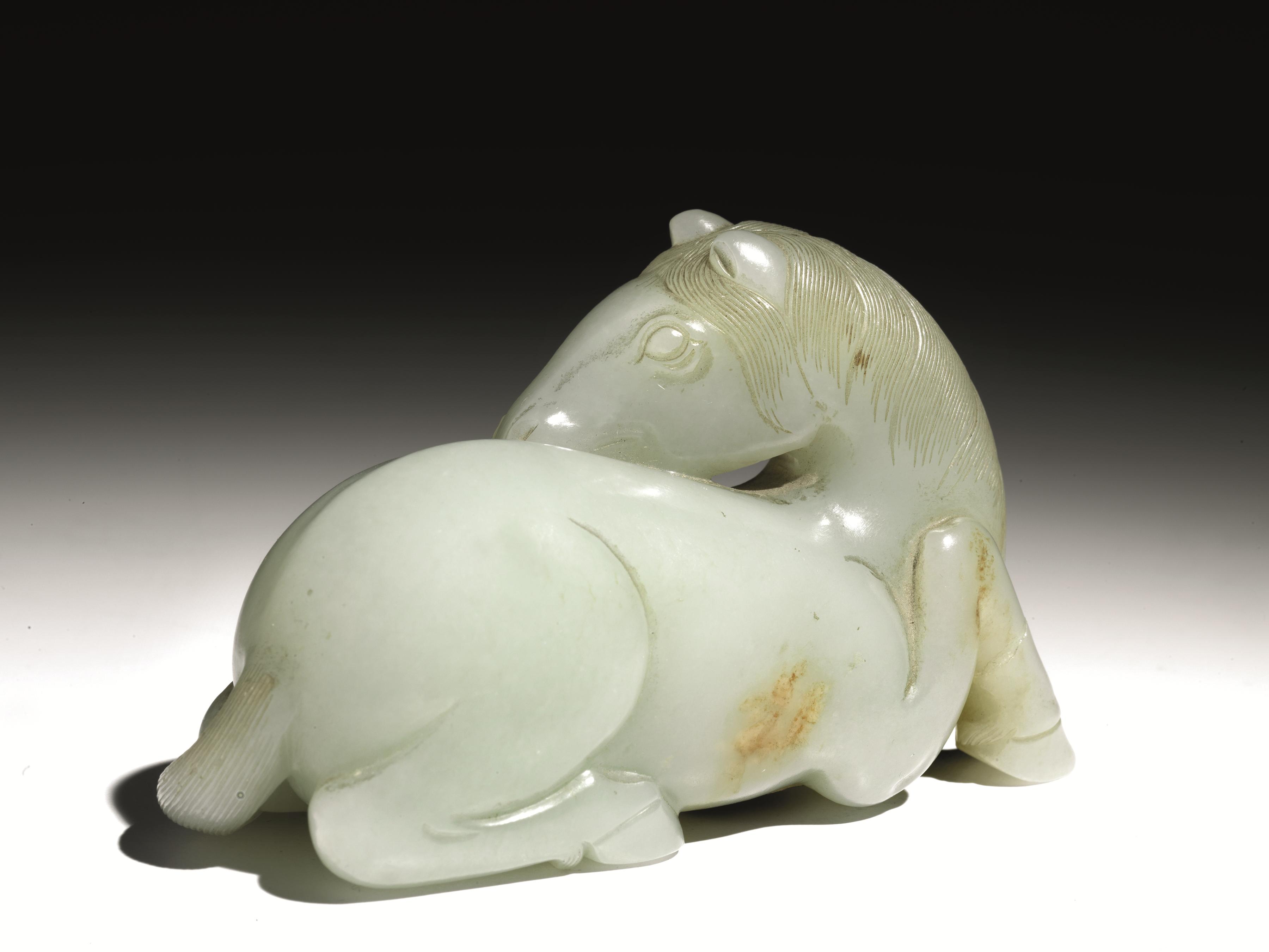 A fine celadon jade reclining horse, Qianlong period (1736-1795)