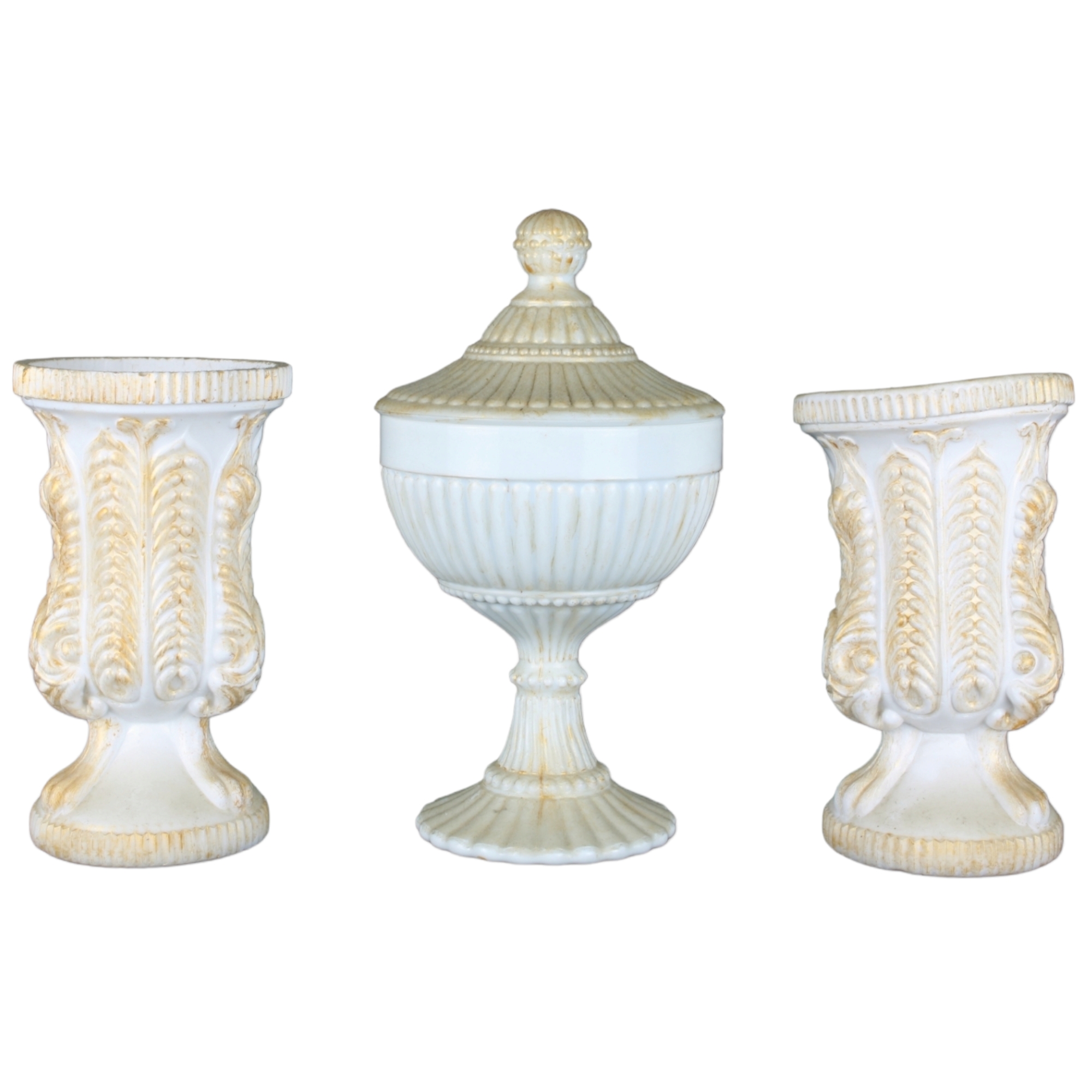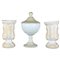 TRITTICO IN OPALINE COMPOSTO DA: 2 vasi e 1 coppa con coperchio decorati da motivi fogliacei h cm 22 x 12 / h cm 17 x 9,5