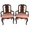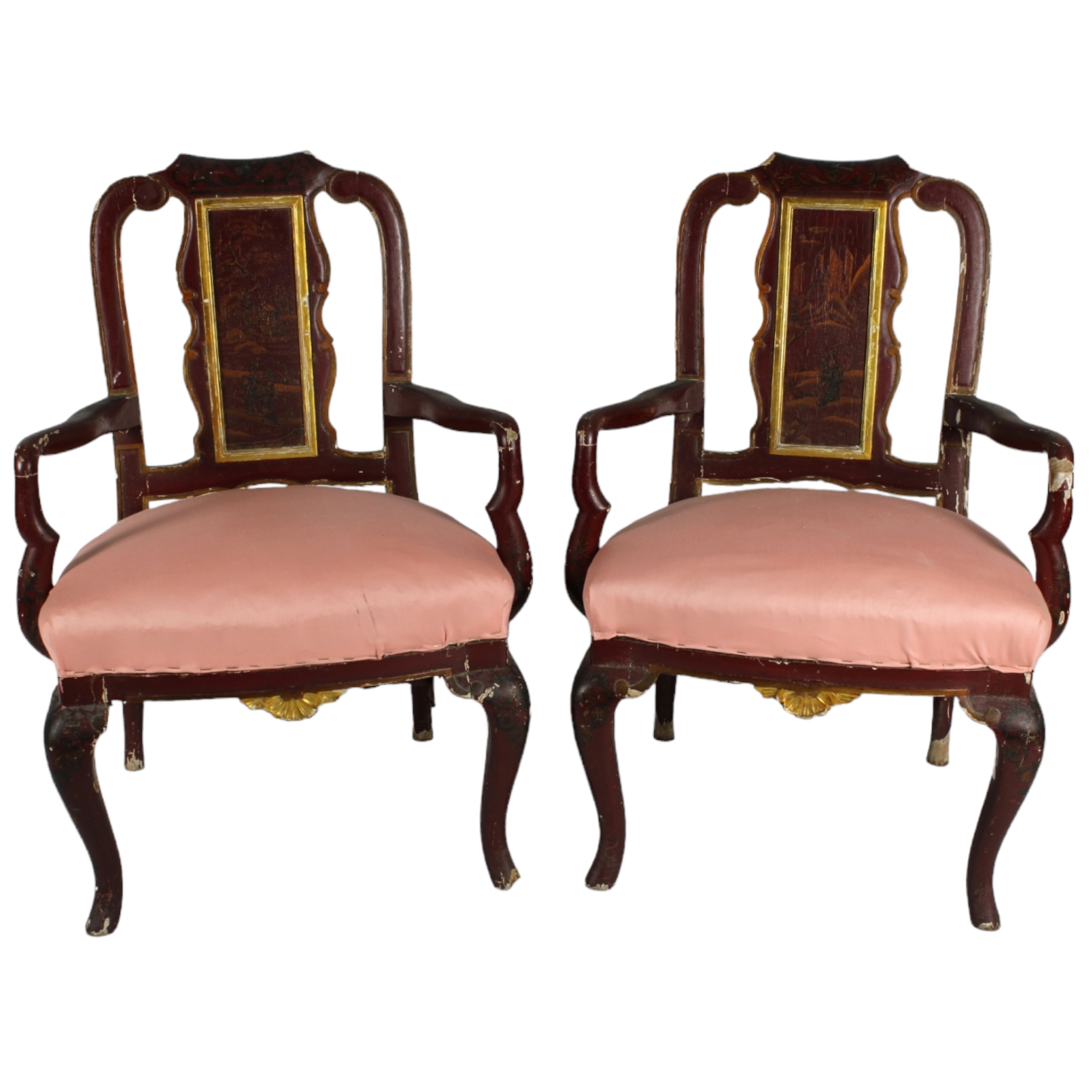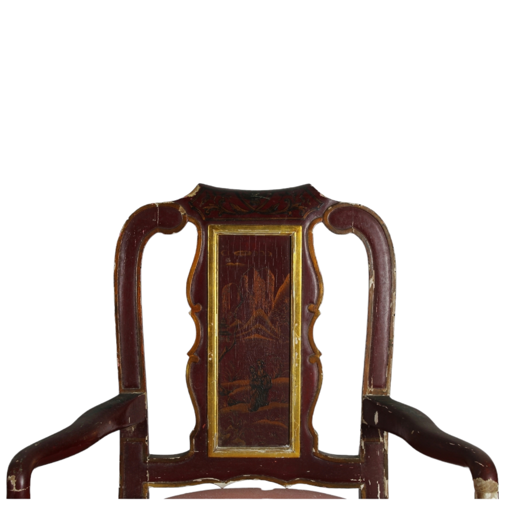 COPPIA DI POLTRONE in legno laccato rosso decorate da figurine e soggetti orientali XIX secolo Italia da restaurare