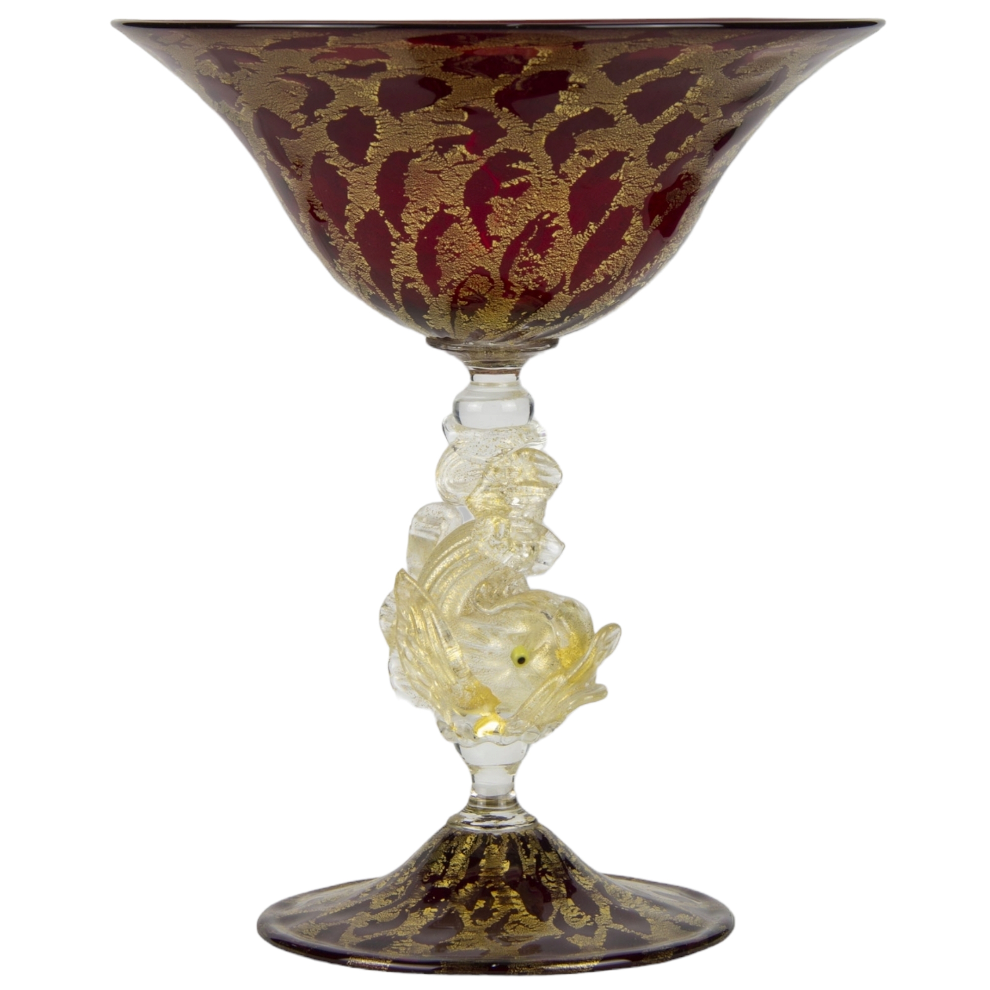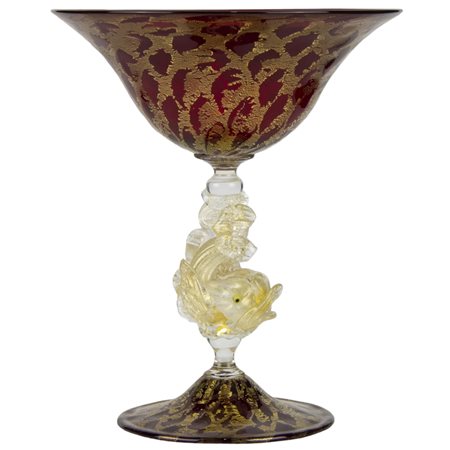 ALZATA IN VETRO DI MURANO vetro rosso e oro retta da delfino in vetro incolore XX secolo fornaci veneziane h cm 18 x 15