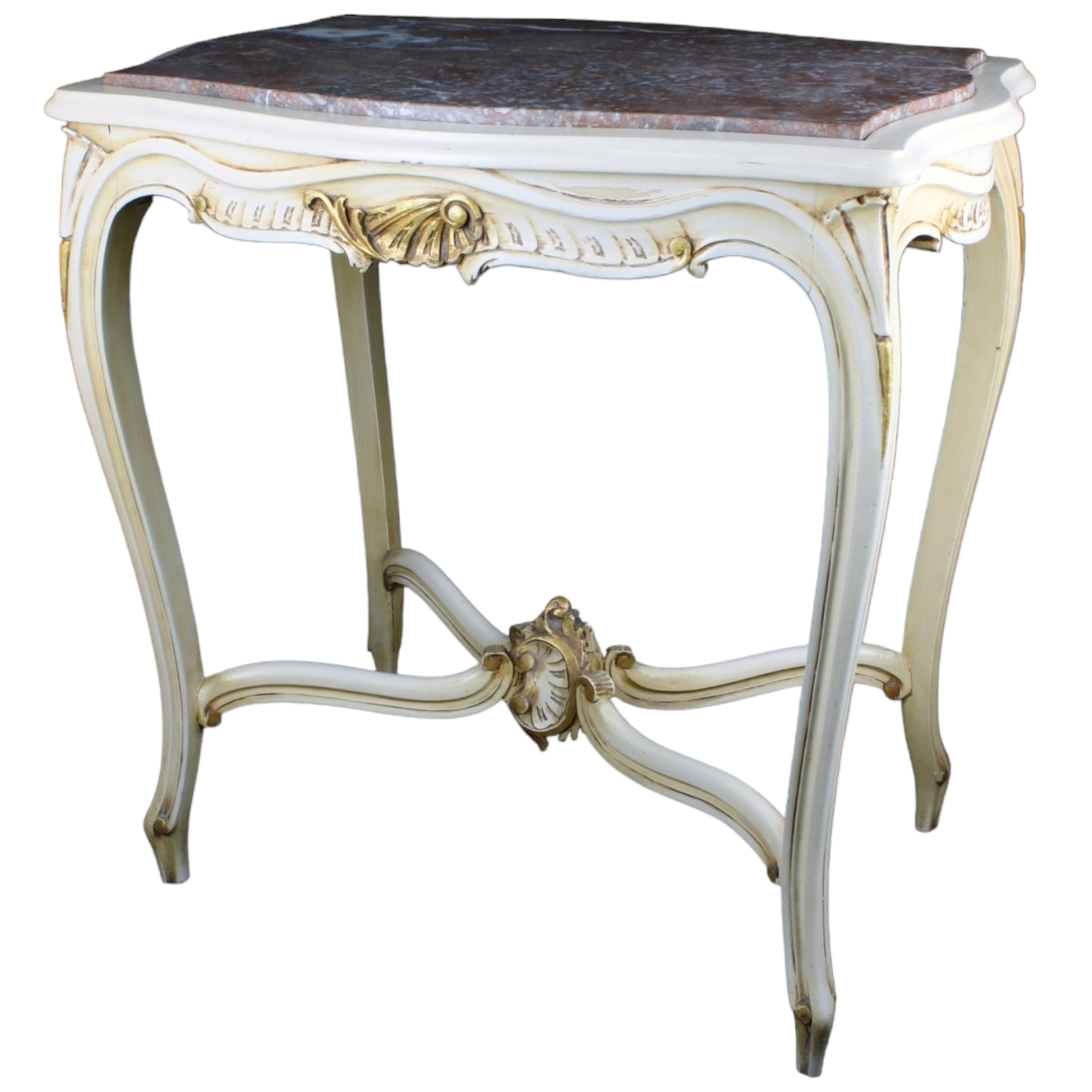 TAVOLINO in legno laccato e lumeggiato da dorature, piano in breccia h cm 78 x 77,5 x 54,4