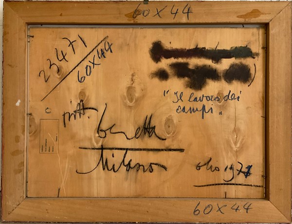 Ignoto "Il lavoro dei campi" 1971, olio su tavola (cm 44x60) , firmato Beretta, titolato, datato e iscritto al verso