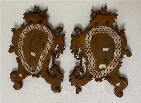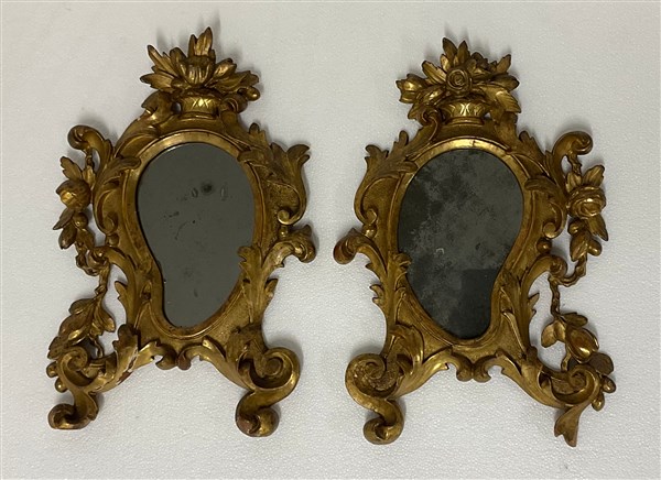 Due specchiere sagomate in legno intagliato e dorato decorate a volute fogliate (cm 27x40) (difetti e rotture)