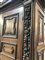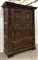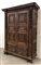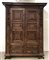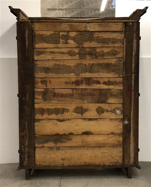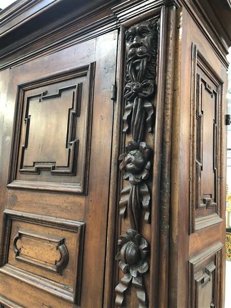 Antico grande armadio in noce con fronte a due ante e due cassetti a pannellature mistilinee. Due ante nei fianchi con stesso decoro. Lesene con rilievi intagliati a testa leonina reggente nastro e frutti, cappello gradinato e piedi a volute. Interni con ripiani (cm 209x274,5x79) (difetti)