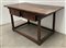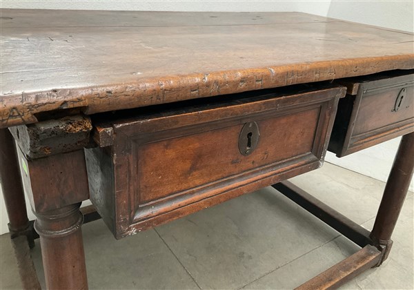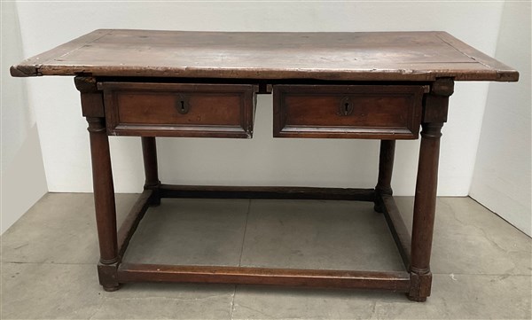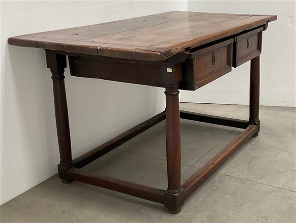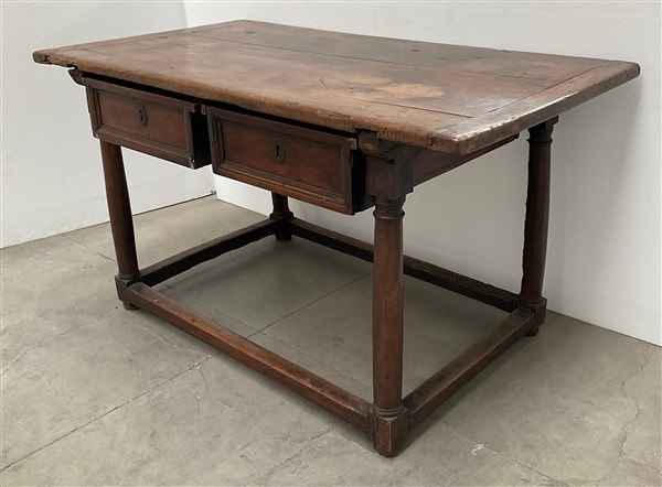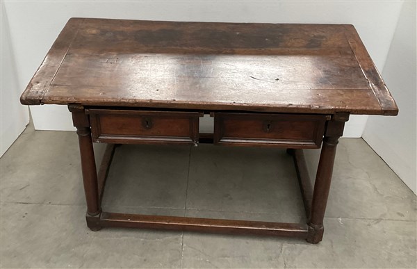 Tavolo in legni vari con fronte a due cassetti, gambe a colonna raccordate da traverse. Secolo XVII (cm 79x145x77) (difetti, restauri e sostituzioni)
