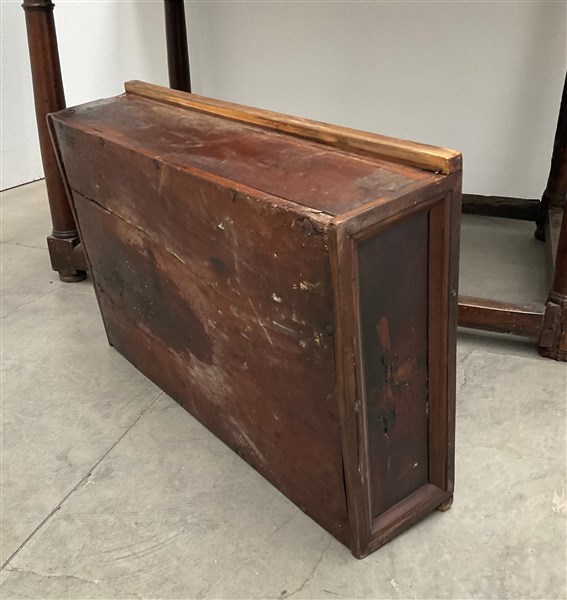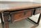 Tavolo in legni vari con fronte a due cassetti, gambe a colonna raccordate da t
