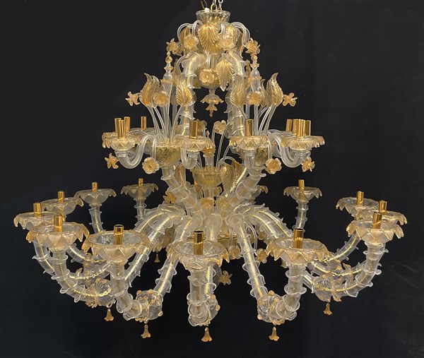 Manifattura di Murano, lampadario in vetro incolore e dorato a ventisei luci a