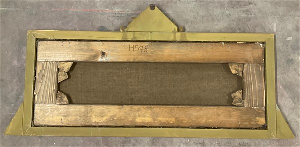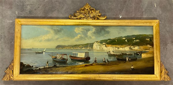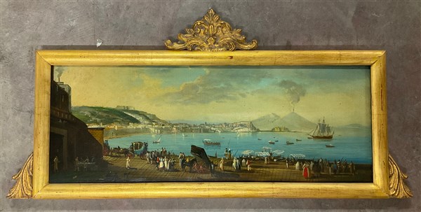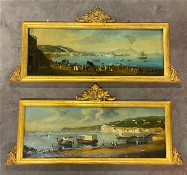 Maestro del XIX secolo, Coppia di oli su tela raffiguranti una "Veduta napoletana" e uno "Scorcio lacustre" (cm 80x30) In cornici in legno intagliato e dorato (difetti)