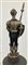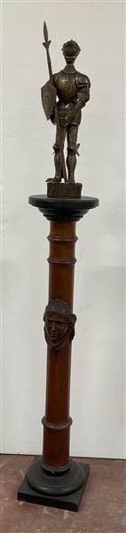 Manifattura spagnola, secolo XX. Modello in miniatura di armatura cavalleresca in ferro, portante armatura mobile completa di scudo e alabarda. Inciso all'acido a motivi fitili (h. cm 55) Piano e base ebanizzati (h. cm 110) (difetti)