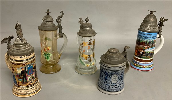 Lotto composto da cinque boccali diversi in ceramica e vetro con coperchi in peltro (h max cm 26) (difetti)