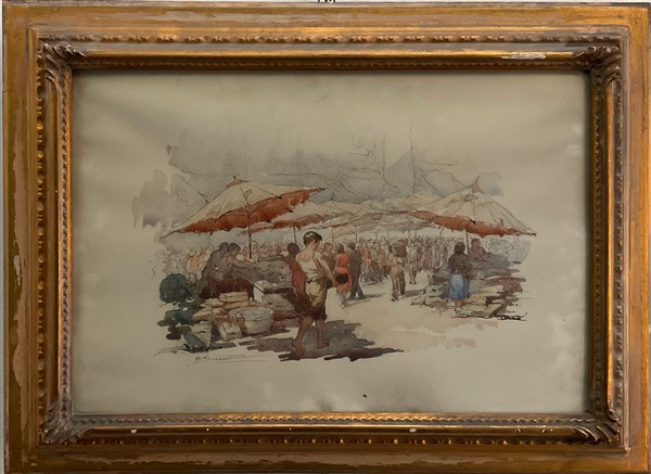 Giorgio Scarpati, "Mercato a Napoli", acquerello su carta (cm 34x49) Firmato in