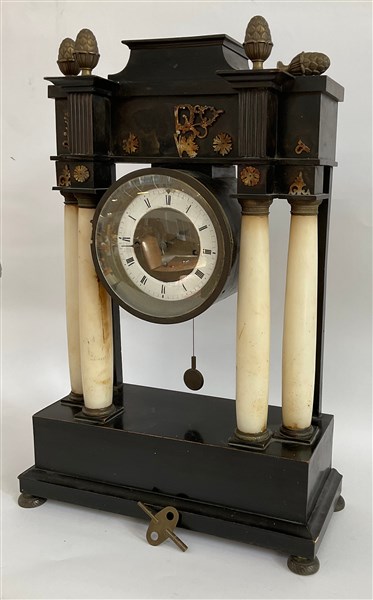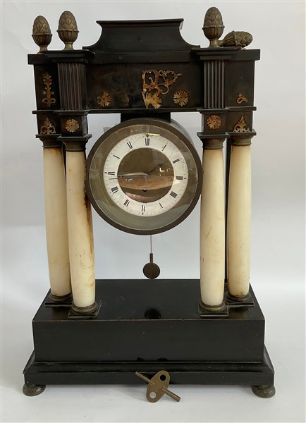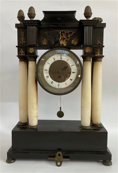 Pendola a portico con cassa in legno ebanizzato e colonne in alabastro con inserti in madreperla. Quadrante a fascia in smalto bianco a numeri romani. Movimento a tre treni con suoneria delle ore e quarti su gong. Austria, 1830/40 (h. cm 54) (difetti e mancanze)
