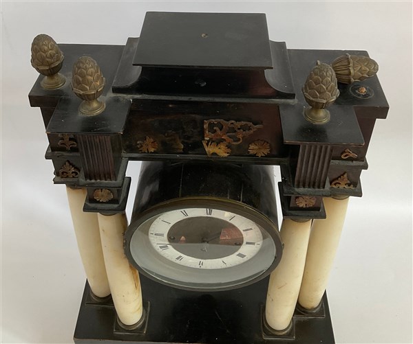 Pendola a portico con cassa in legno ebanizzato e colonne in alabastro con inse
