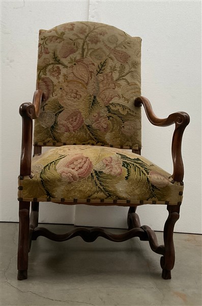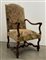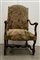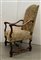 Antica poltrona in noce intagliato a ossa di montone con gambe raccordate da traverse. (L. seduta cm 62) (difetti)