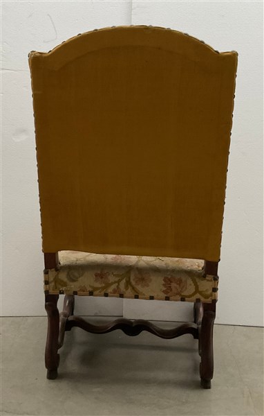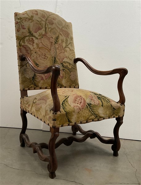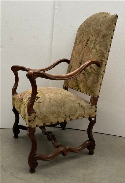 Antica poltrona in noce intagliato a ossa di montone con gambe raccordate da tr