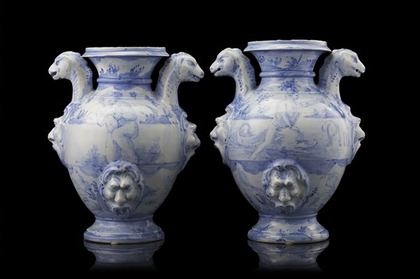 Ligurian manufacture, 19th century. Pair of majolica hydria decorated with classical figures in landscapes, one with cartouche bearing apothecary inscription in Gothic characters. Sea monster handles with masks at the attachment (h. max cm 22,5) (defects)