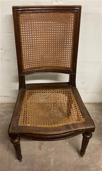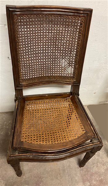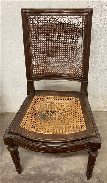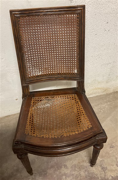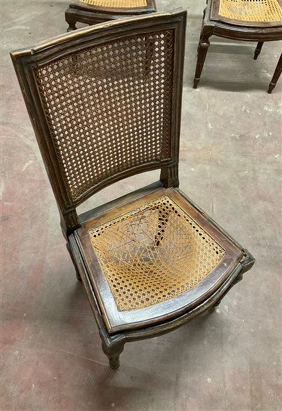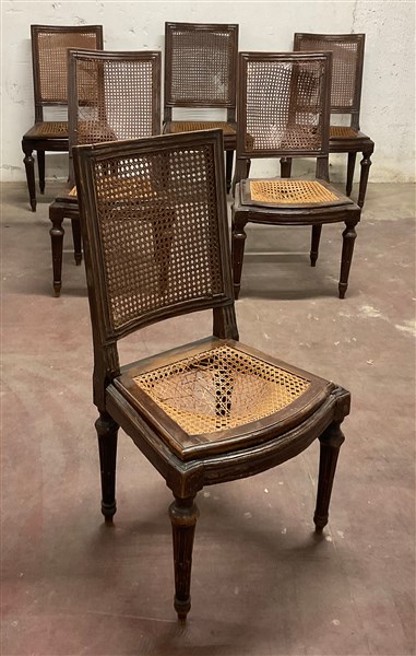 Gruppo di sei sedie in legno intagliato con seduta e schienale incannucciate (difetti e rotture)