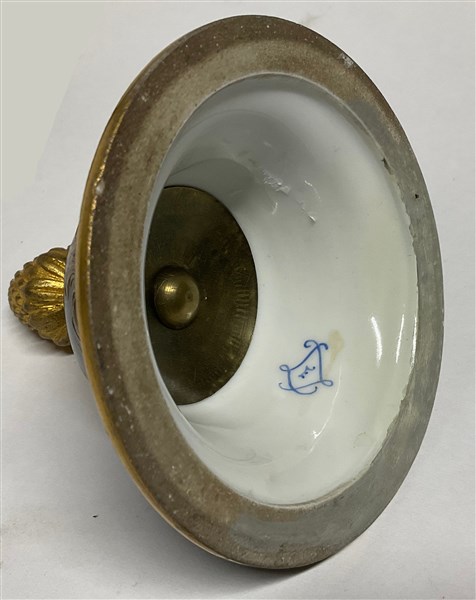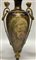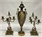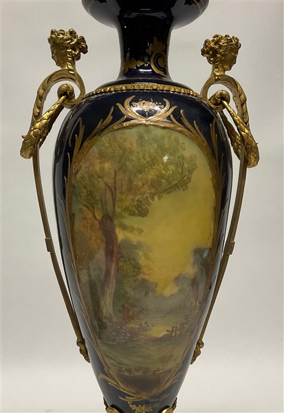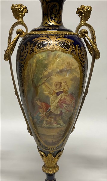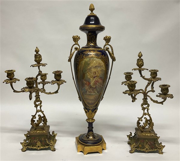 Lotto composto da un vaso in porcellana in stile Sevres con decori policromi e profili in oro su fondo blu, anse e montature in metallo dorato unito ad una coppia di candelabri in metallo dorato a cinque fiamme su base sagomata in legno dipinto a fiori policromi (h max cm 72). Francia, inizio secolo XX (difetti, mancanze e restauri)