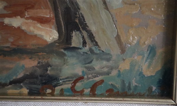 Firma indecifrata "Alberi" olio su compensato (cm 34x50) firmato in basso a destra