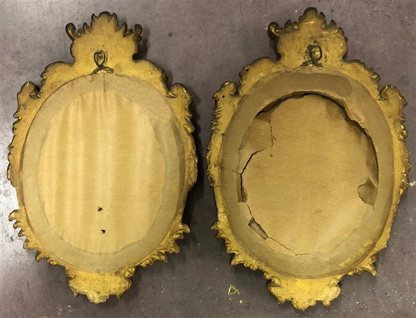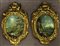 Pittore del secolo XX "Paesaggi fluviali con figure" coppia di oli su cartone ovale telato (cm 14x11) In cornice in legno intagliato e dorato del secolo XIX (lievi difetti e mancanze)
