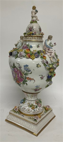 Manifattura tedesca, secolo XIX - XX. Vaso con coperchio in porcellana dipinta in policromia a balaustro biansato e cimato da figure, decoro con scena biblica entro riserva e fiori a rilievo (cm 30x64) (difetti, restauri e coperchio incollato)