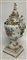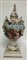 Manifattura tedesca, secolo XIX - XX. Vaso con coperchio in porcellana dipinta in policromia a balaustro biansato e cimato da figure, decoro con scena biblica entro riserva e fiori a rilievo (cm 30x64) (difetti, restauri e coperchio incollato)