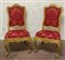 Coppia di antiche sedie in legno intagliato e dorato con decoro a volute e roca