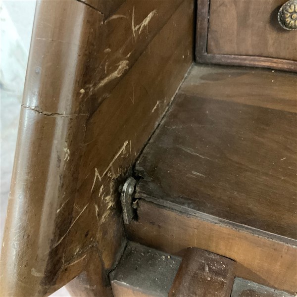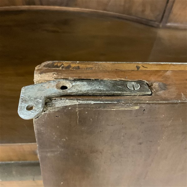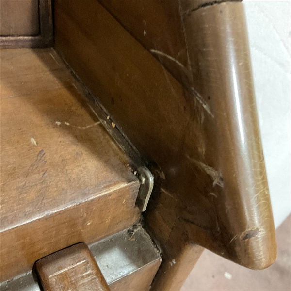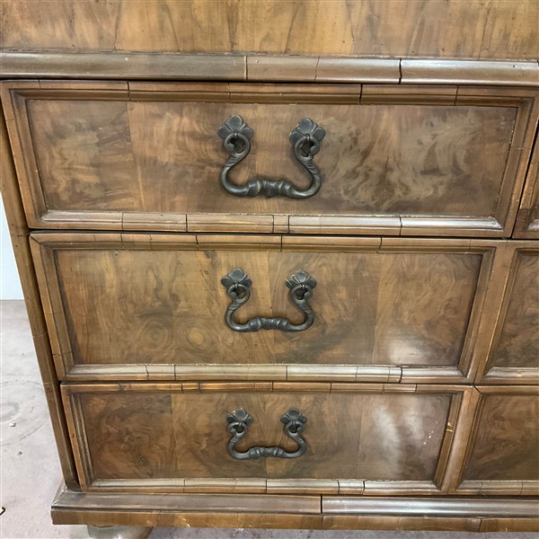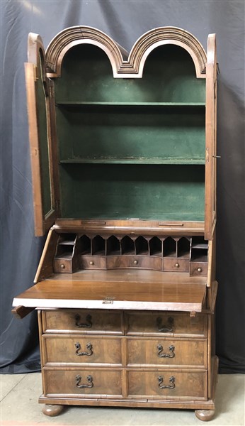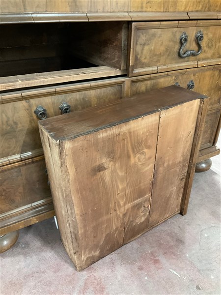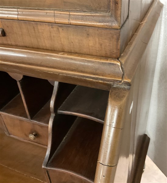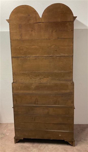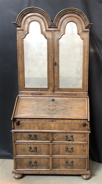 Trumeau in legno con parte inferiore a due cassetti più due a mezza lunghezza. La calatoia rivela cassettini e vani a giorno. Parte superiore a due ante con specchi (cm 104x53x228) (difetti e mancanze)