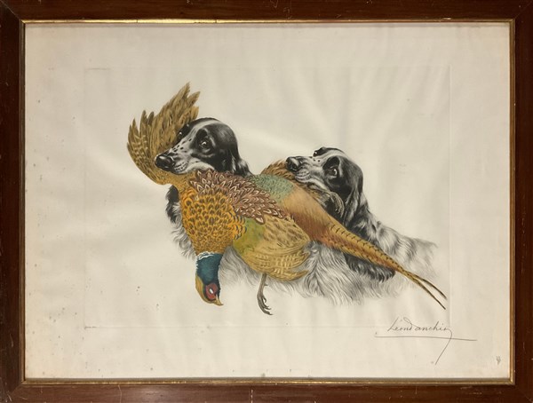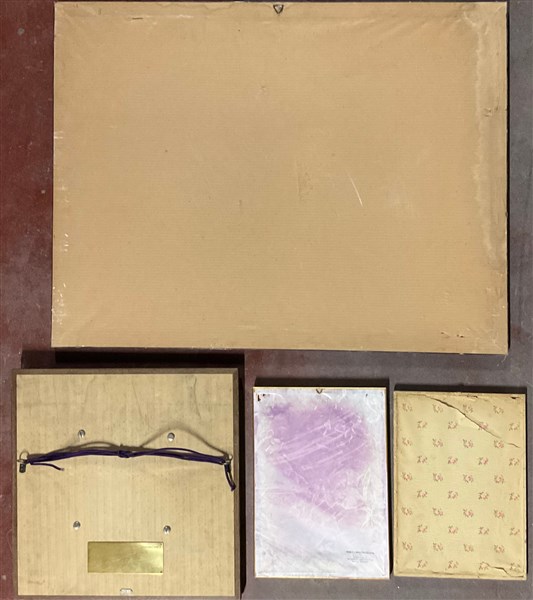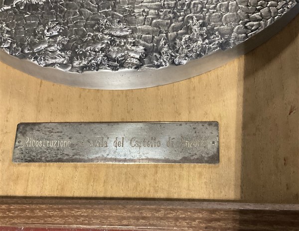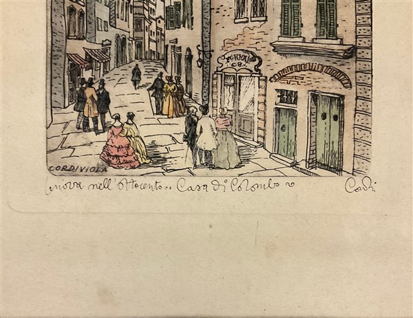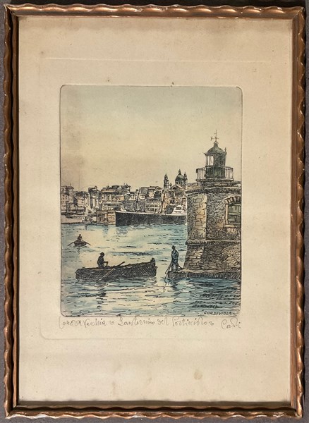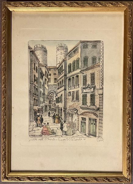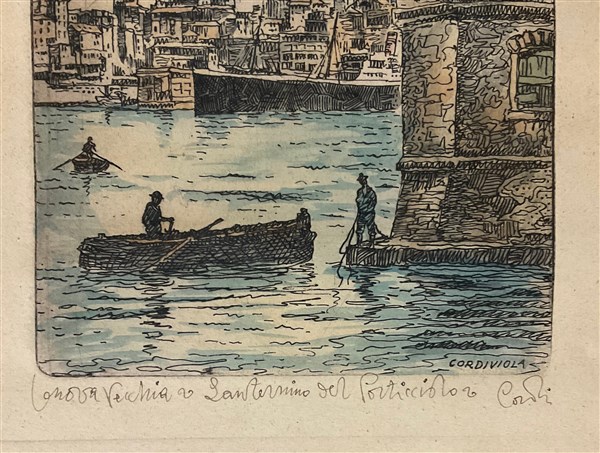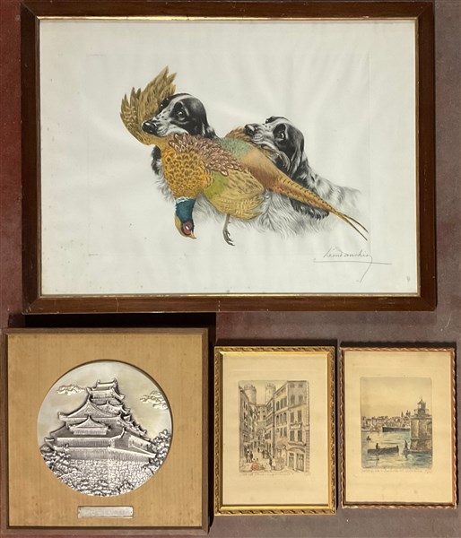 Lotto composto da due acqueforti raffiguranti vedute di città (fogli cm 34x24) firmate Cordiviola e titolate in basso, una litografia a colori raffigurante scena di caccia (cm 62x84) firmata e numerata 139/500 in basso e un multiplo in metallo argentato montato su pannello (diam. cm 29) raffigurante ricostruzione in scala del Castello di Anzucci