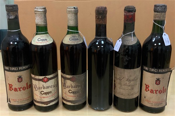 Lotto composto da sei bottiglie di Barolo (difetti alle bottiglie, alle etiche