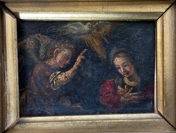 Ignoto, antico dipinto ad olio su rame raffigurante l'Annunciazione (cm 7,6x9,5