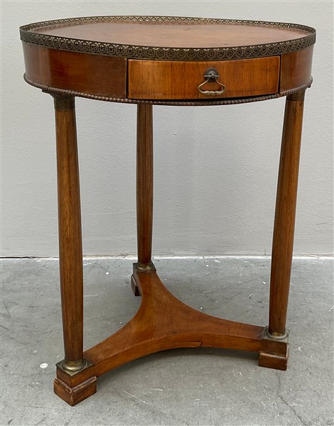 Tavolo "Impero" con piano circolare sormontato da ringhiera in metallo. Un cassetto nella fascia, gambe a colonna riunite da piano sagomato (cm d 40 x h 51) (difetti)