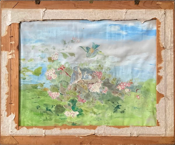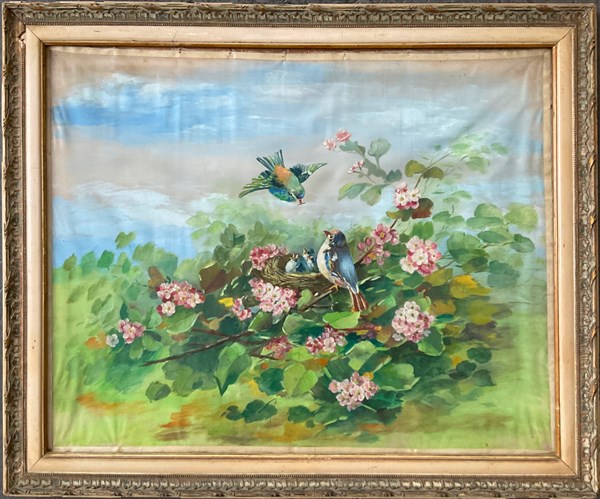 Lotto composto da due dipinti su seta raffiguranti rispettivamente Madonna orientale con Bambino e iscrizione e volatili con nido e ramo fiorito, misure diverse, in cornici (difetti)
