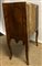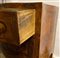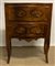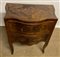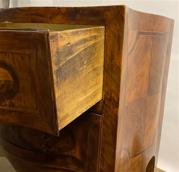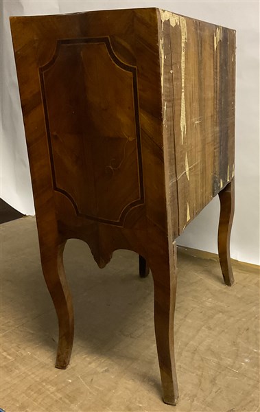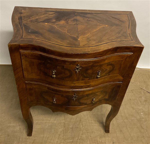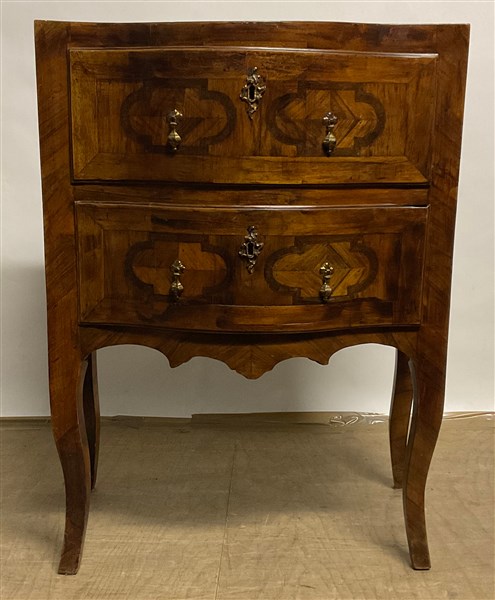 Antico comodino di forma mossa lastronato, filettato e intarsiato a due cassett