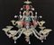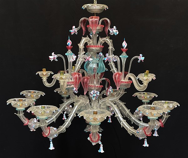 Manifattura di Murano, lampadario in vetro policromo a quindici luci a due ordi